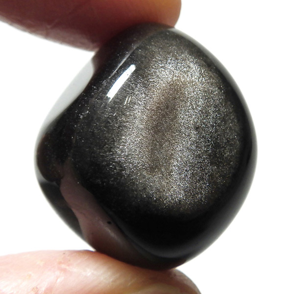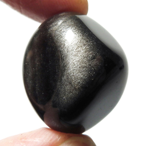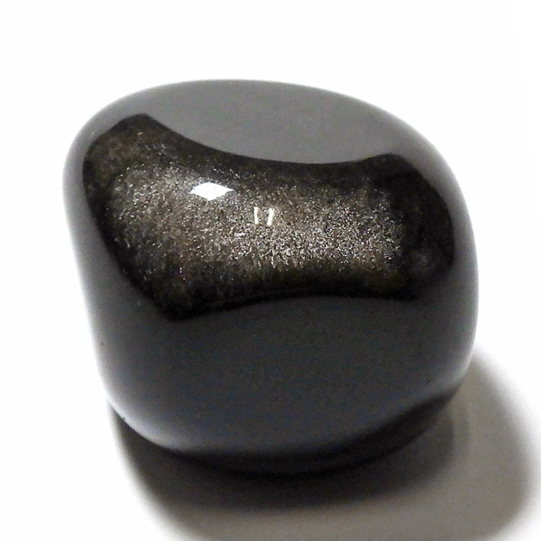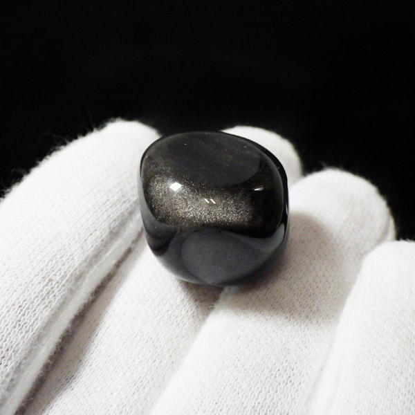 メキシコ産のシルバーオブシディアン、タンブルです。オブシディアンは和名で黒曜石。シルバーオブシディアンは黒曜石の中でもシルバーのシラー光沢を確認できる天然の火山ガラスです。マグマが急速に冷却される過程でナノ粒子が閉じ込められ、その微細な内包物が光を干渉させることで、独特のシルバーの輝きが生まれます。見る角度によってふわりと現れるメタリックな光沢はとてもシックで、クールな存在感を放ちます。