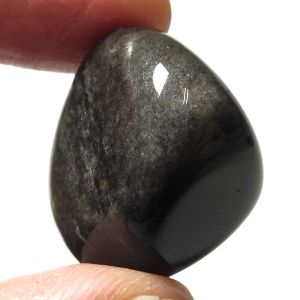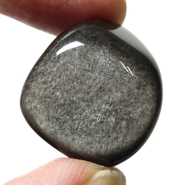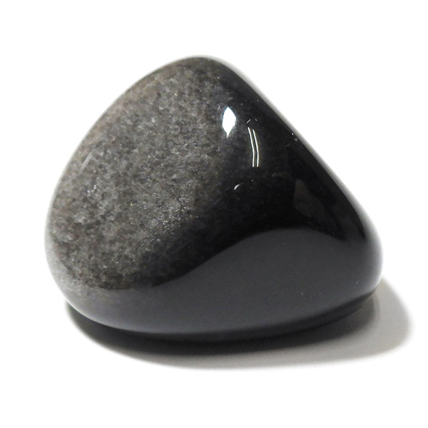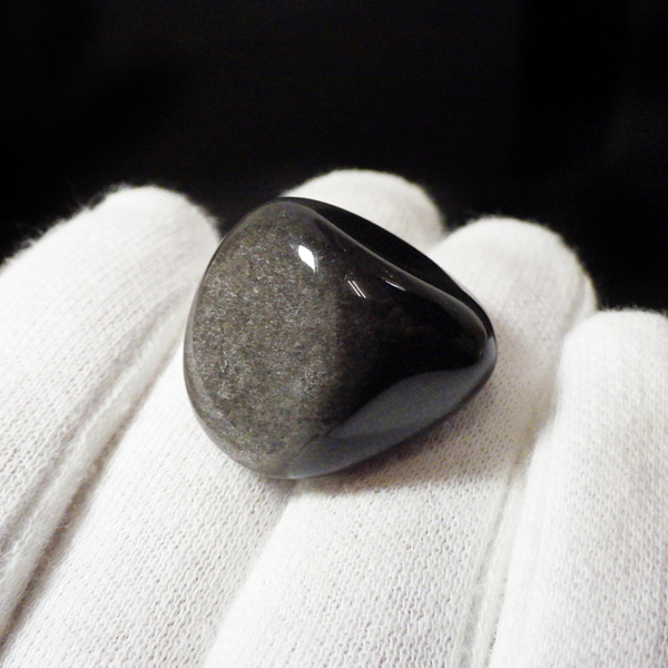 メキシコ産のシルバーオブシディアン、タンブルです。オブシディアンは和名で黒曜石。シルバーオブシディアンは黒曜石の中でもシルバーのシラー光沢を確認できる天然の火山ガラスです。マグマが急速に冷却される過程でナノ粒子が閉じ込められ、その微細な内包物が光を干渉させることで、独特のシルバーの輝きが生まれます。見る角度によってふわりと現れるメタリックな光沢はとてもシックで、クールな存在感を放ちます。