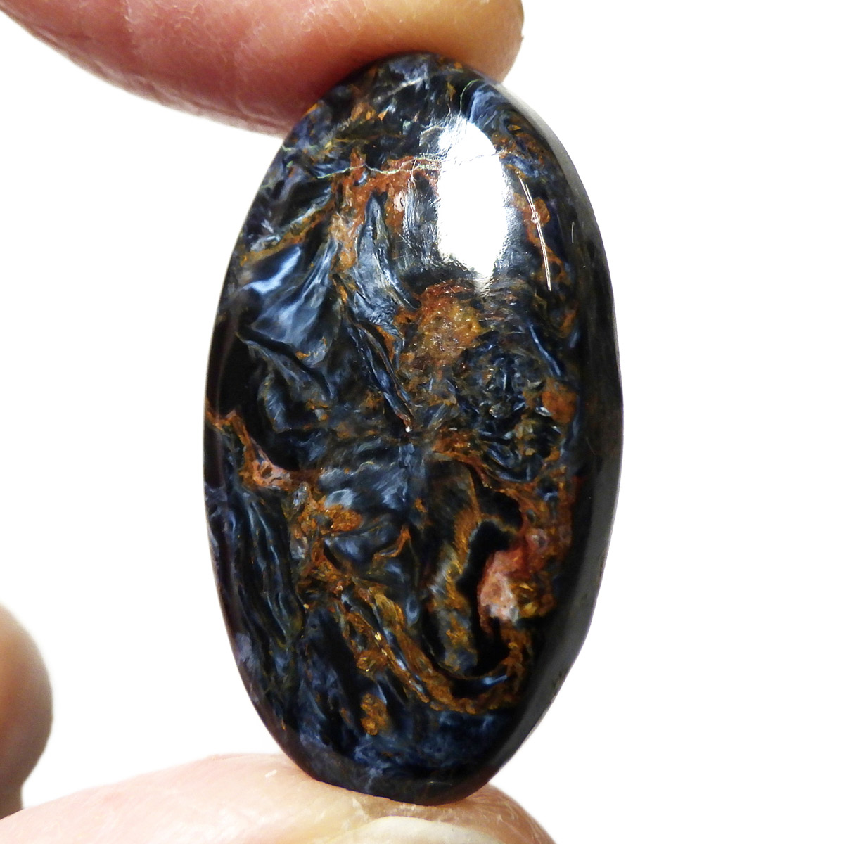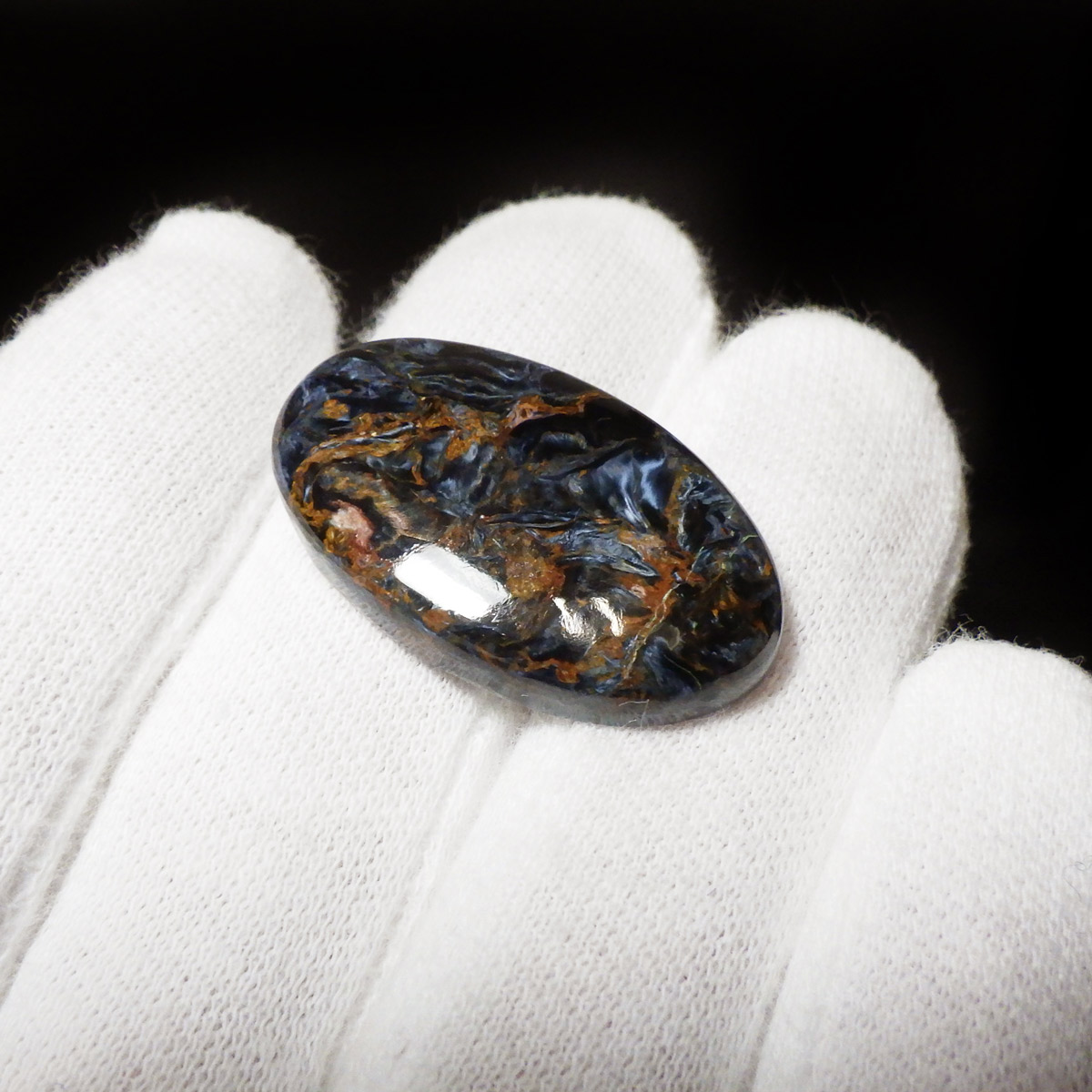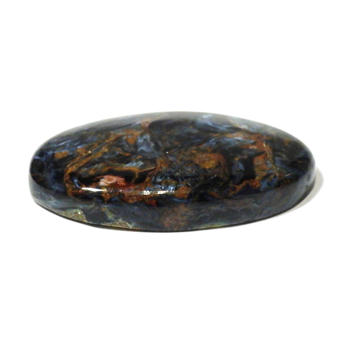 ナミビア産ブルーピーターサイトのルースです。タイガーアイの成分を持つ鉱物が、地殻変動によって粉砕され、膨大な年月を掛けて石英により自然に接合されて出来た鉱物です。そのため、タイガーアイのように繊維が直線状に形成されず、油絵のような独特のうねりのある模様になります。名称は「シド・ピーターズ」によってナミビアで初めて発見されたため、発見者にちなんで「ピーターサイト」と命名されました。独特の色模様が、嵐のようにも見えることから、別名「テンペストストーン(嵐の石)」とも呼ばれることが有ります。鉱物学的名正式名称はクロシドライトアゲートとなります。