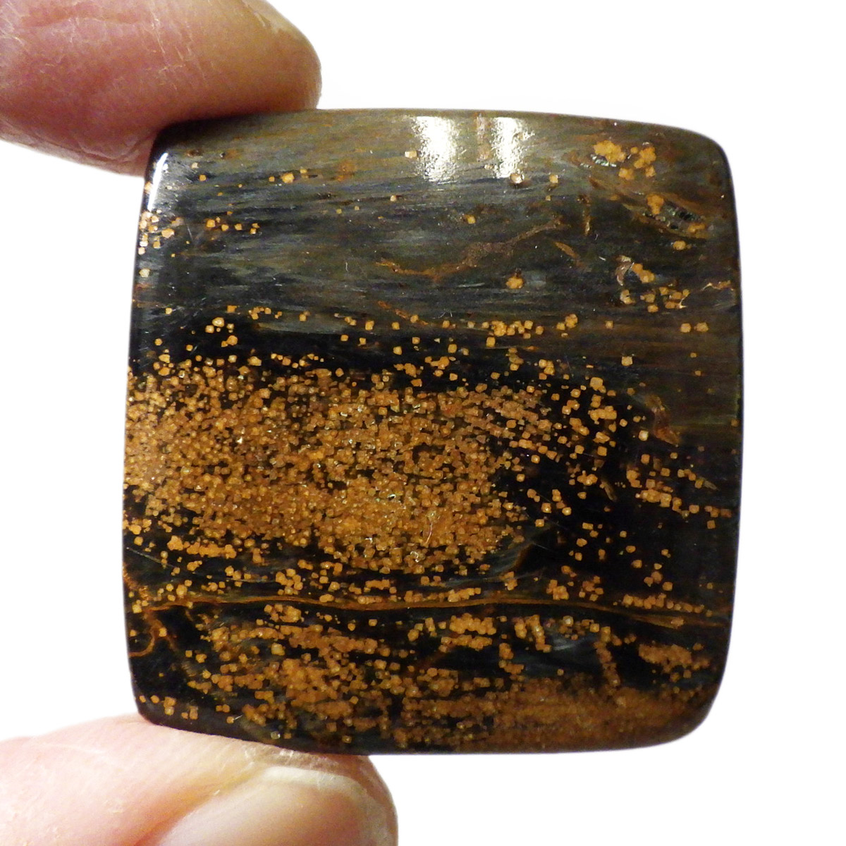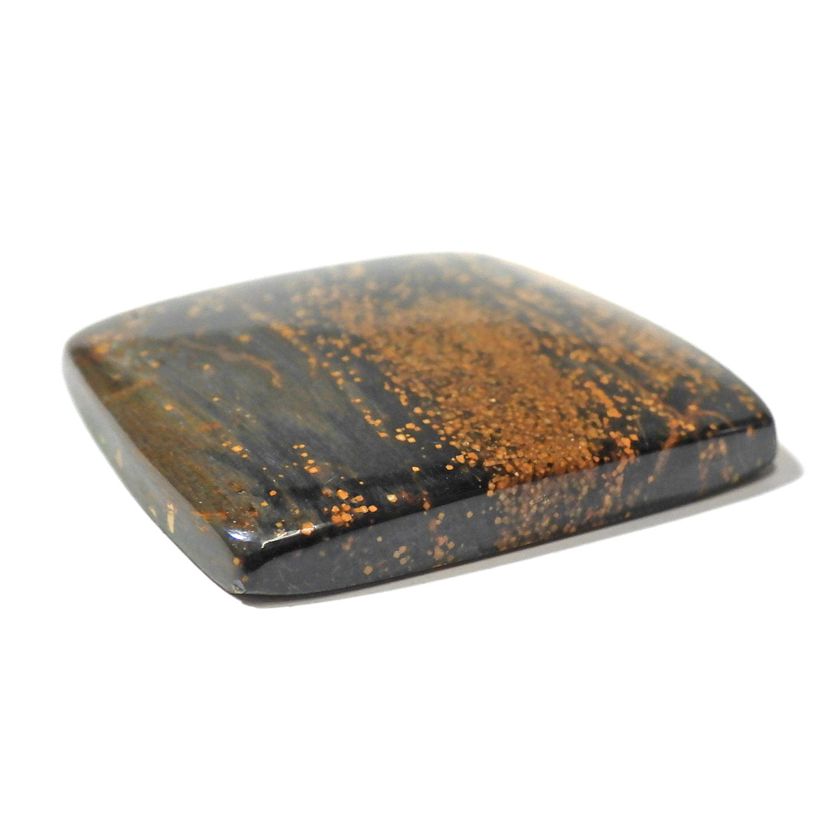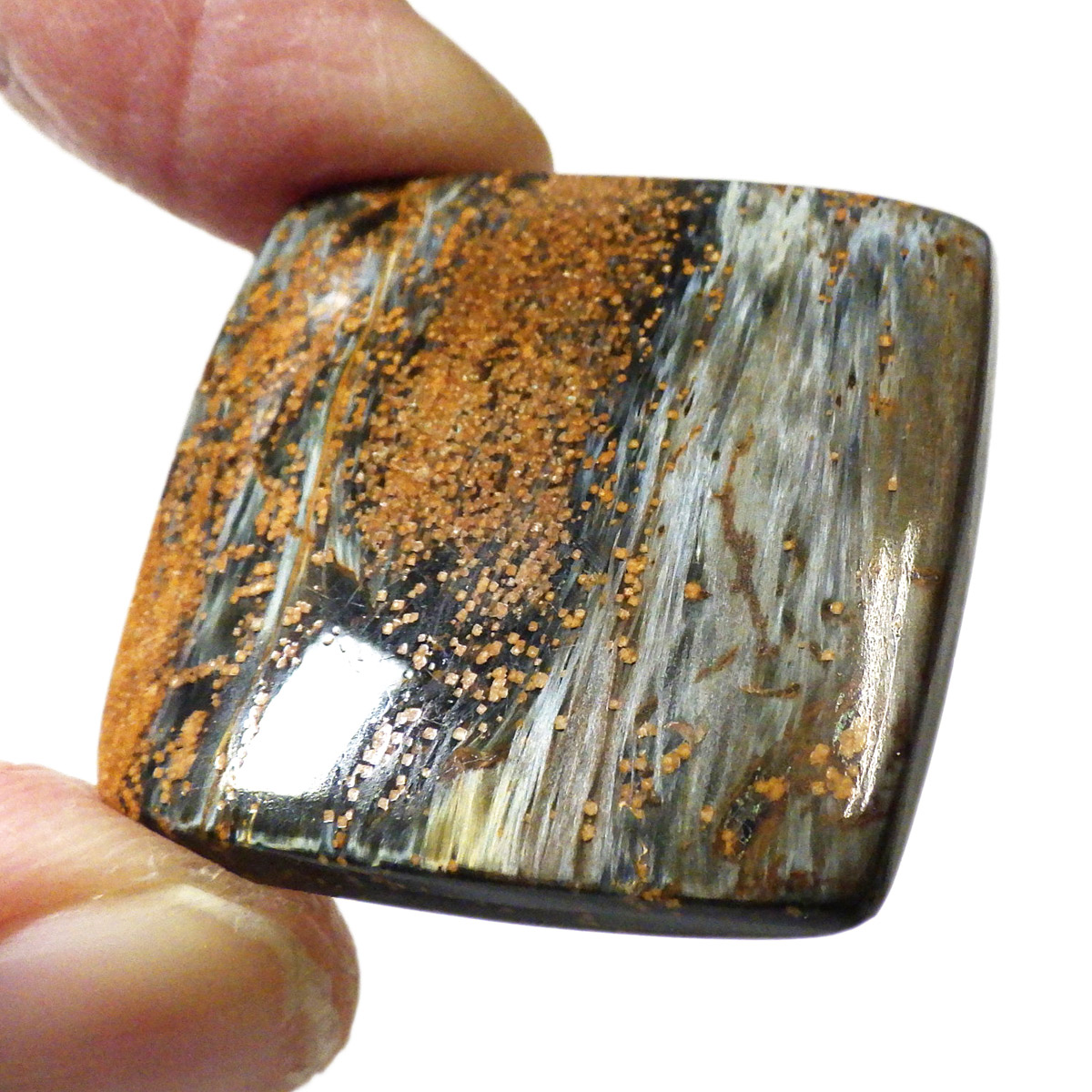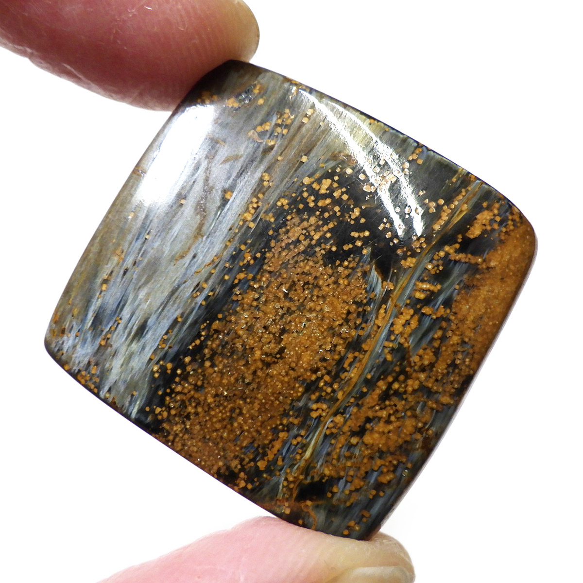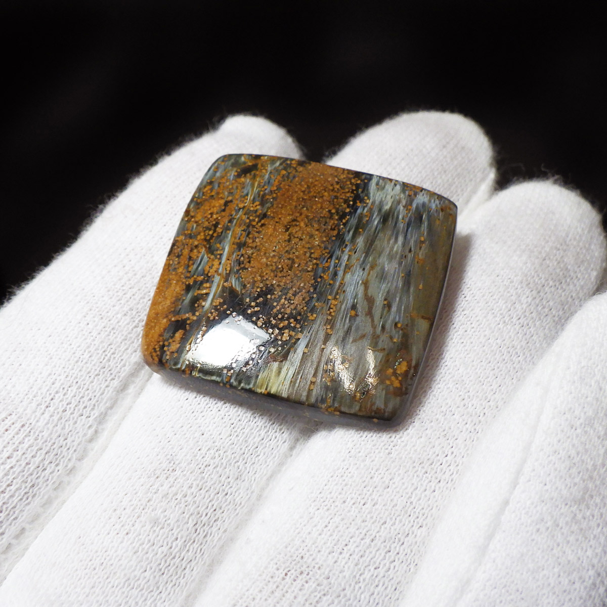 ナミビア産ブルーピーターサイトのルースです。タイガーアイの成分を持つ鉱物が、地殻変動によって粉砕され、膨大な年月を掛けて石英により自然に接合されて出来た鉱物です。そのため、タイガーアイのように繊維が直線状に形成されず、油絵のような独特のうねりのある模様になります。名称は「シド・ピーターズ」によってナミビアで初めて発見されたため、発見者にちなんで「ピーターサイト」と命名されました。独特の色模様が、嵐のようにも見えることから、別名「テンペストストーン(嵐の石)」とも呼ばれることが有ります。鉱物学的名正式名称はクロシドライトアゲートとなります。