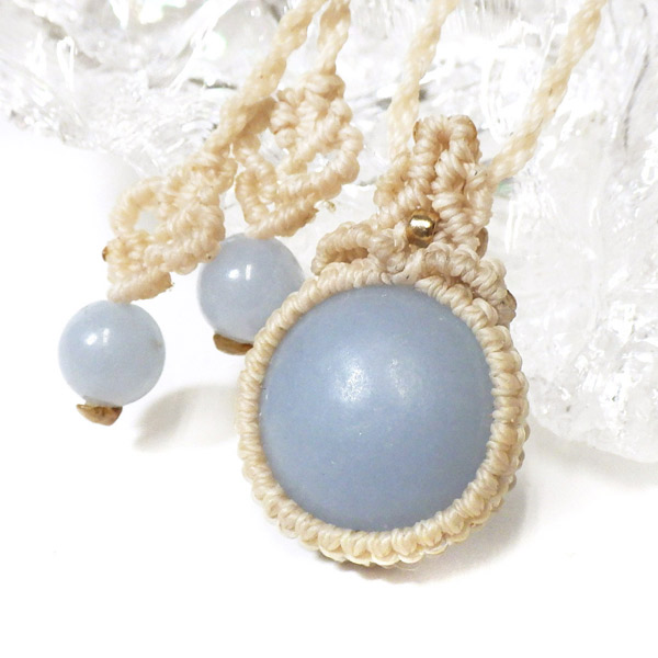 ペルー産エンジェライトを使用したマクラメペンダントです。 やわらかな空色が印象的で、穏やかさと優しさを感じさせる石です。 石の雰囲気を損なわないよう、ナチュラルなマクラメ編みで丁寧に包み込みました。 癒しや安心感を求める方におすすめです。