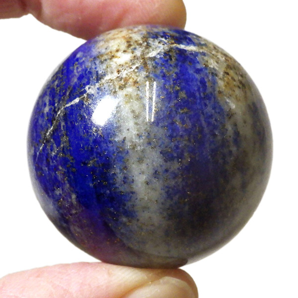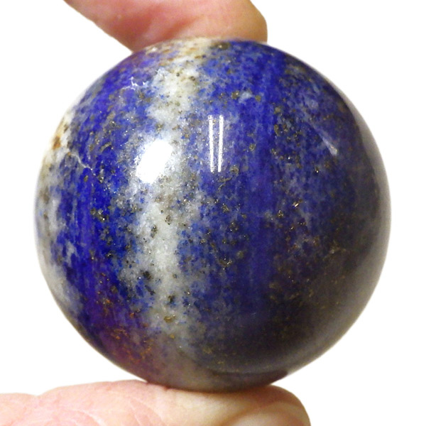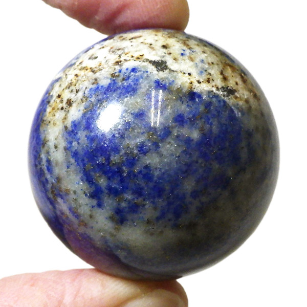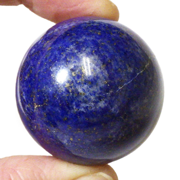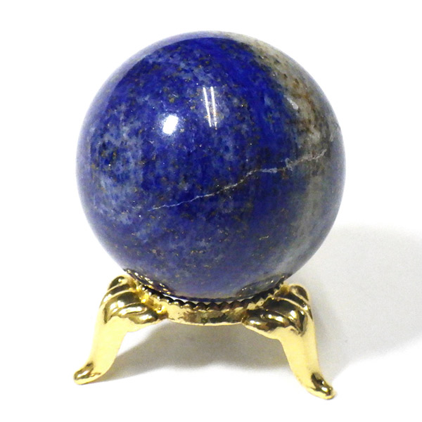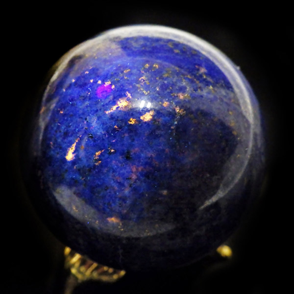 アフガニスタン産のラピスラズリ球です。ラピスラズリは、ラズライト・アウィン・ソーダライト・ノーゼライトが集合したものです。特に、ラズライトとノーゼライトを多く含有すると、深く美しい色彩のラピスラズリとなります。黄金色のパイライト、白色のカルサイトなど"が小さな斑点としてみられます。365nmのブラックライトによる鮮やかな黄色・オレンジの蛍光はソーダライト起因、ピンク系の蛍光はカルサイトによるものと思われます。ラピスラズリは幸福を呼び込む石として人気があります。