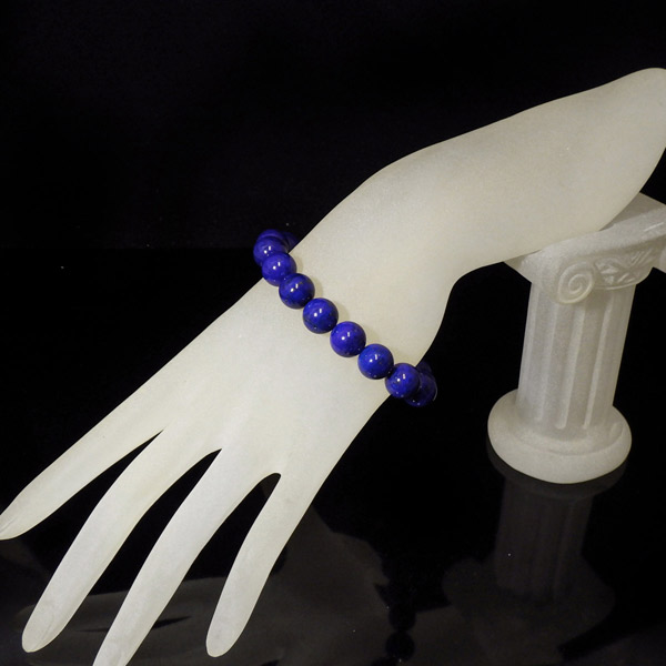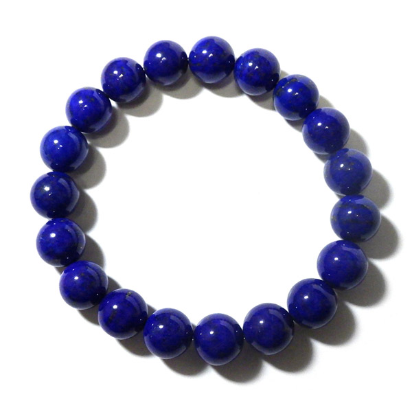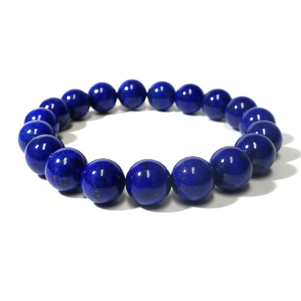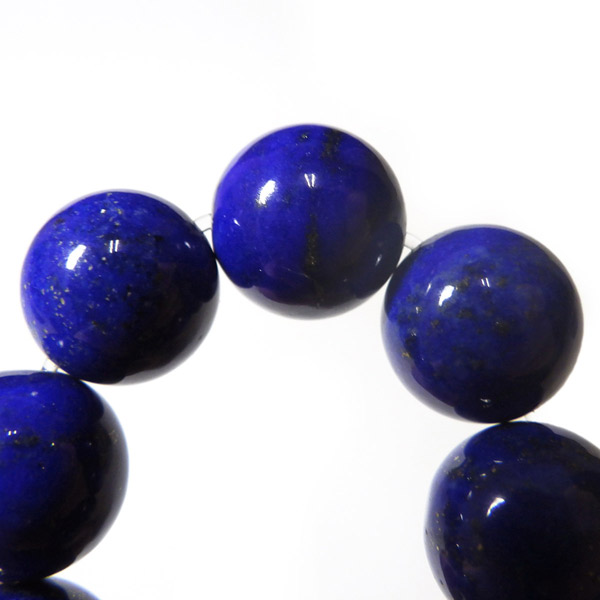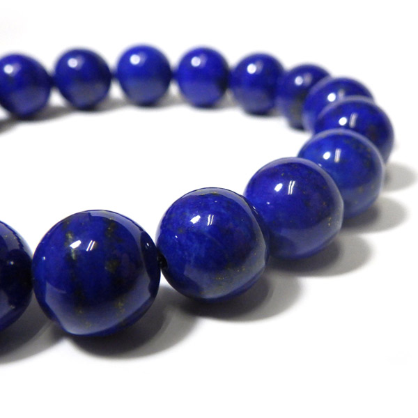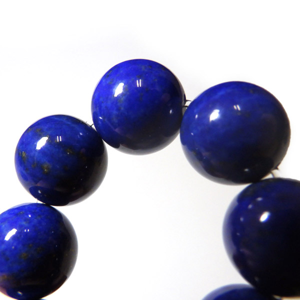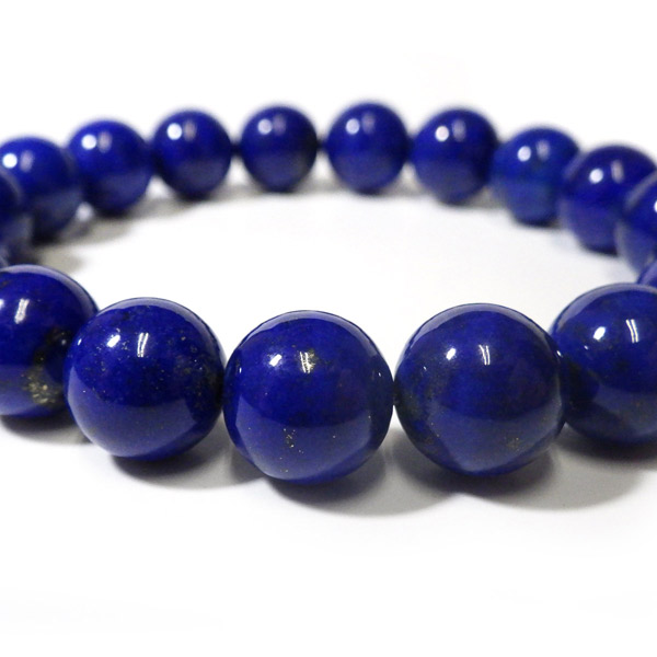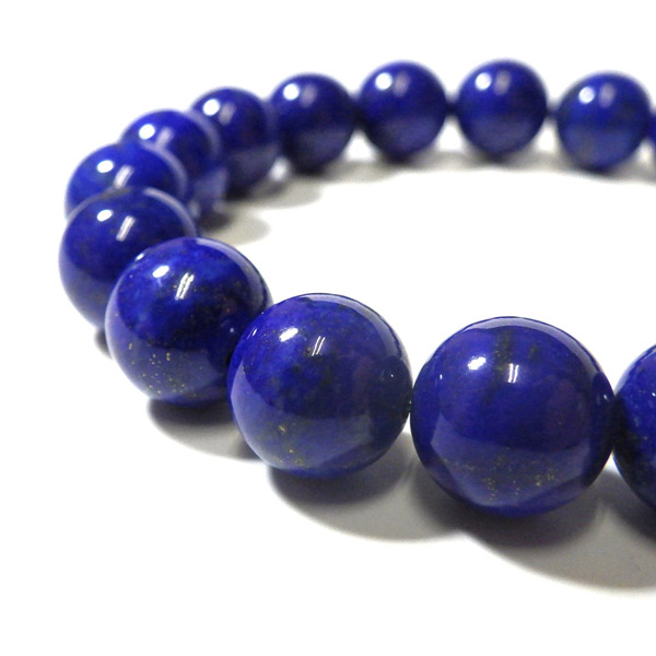 高品質ラピスラズリのブレスレットです。ラピスラズリは、ラズライト・アウィン・ソーダライト・ノーゼライトが集合したものです。特に、ラズライトとノーゼライトを多く含有すると、鮮やかで美しいブルーの色彩のラピスとなります。全体的に、均一な色彩のものは少なく、黄金色の「パイライト」、白色の「カルサイト」などが小さな斑点としてみられます。その中でも、トップクラスのグレードのブレスレットです。