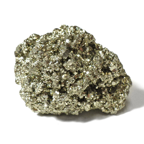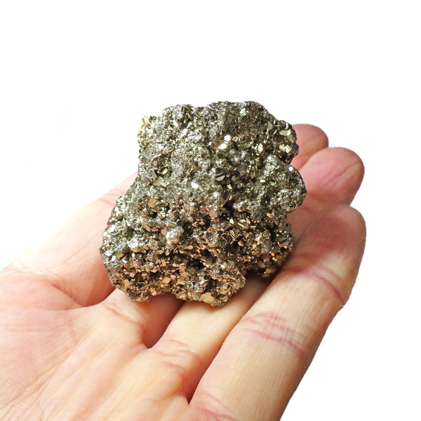 ペルー産のパイライト原石です。コロッとかわいらしいサイズでキラキラが信じられないほどまぶしい原石。パイライトは、火山活動の活発な場所で生成されます。結晶は大変整った六面体や八面体です。金と間違えるほどのゴールドで、硫黄と鉄で構成された鉱物の一種です。