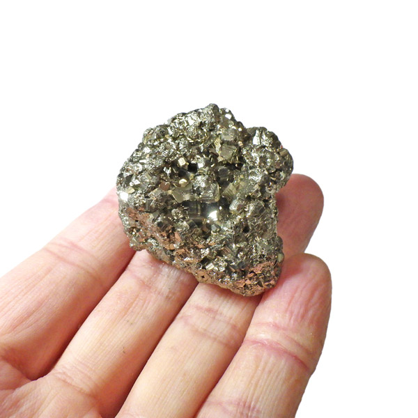 ペルー産のパイライト原石です。コロッとかわいらしいサイズでキラキラが信じられないほどまぶしい原石。パイライトは、火山活動の活発な場所で生成されます。結晶は大変整った六面体や八面体です。金と間違えるほどのゴールドで、硫黄と鉄で構成された鉱物の一種です。