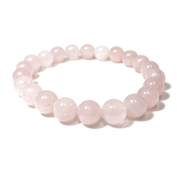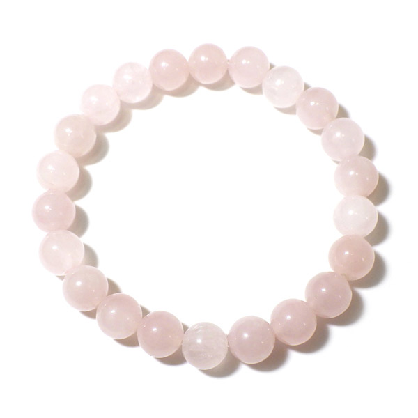 ローズクォーツの8mm玉を使用した天然石ブレスレットです。ローズクォーツは淡いピンク色に色付いた水晶のことで、優しいピンクがかわいらいいブレスレットに仕上がっていますよ。