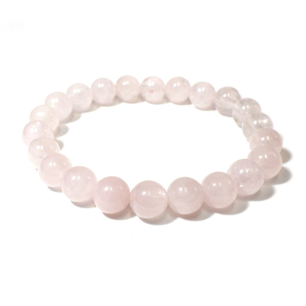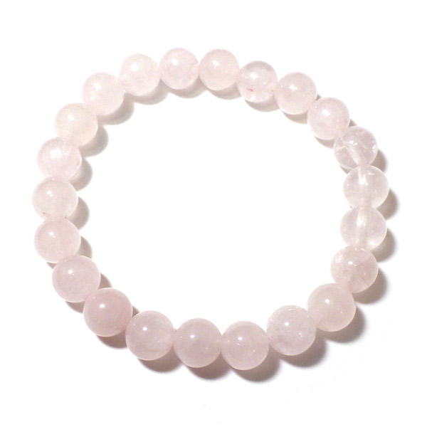 ローズクォーツの8mm玉を使用した天然石ブレスレットです。ローズクォーツは淡いピンク色に色付いた水晶のことで、優しいピンクがかわいらいいブレスレットに仕上がっていますよ。