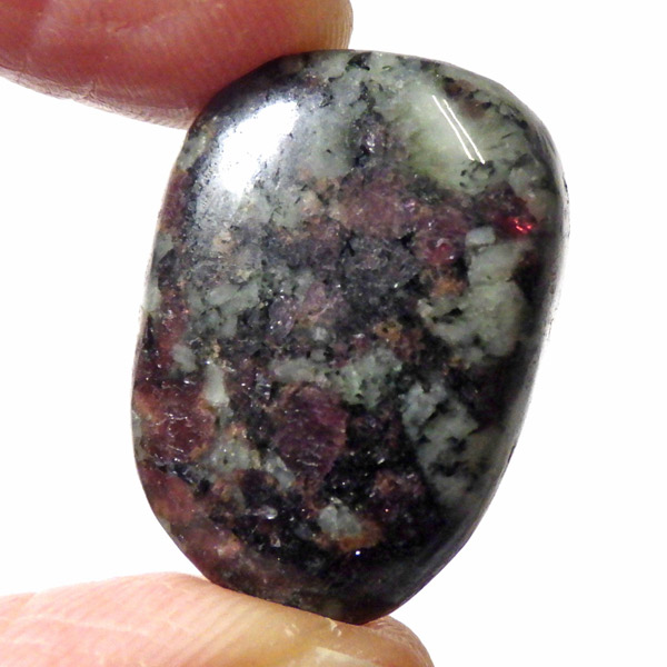 ロシア産のユーディアライト、タンブルです。産出量の少ない希少な石。深いワインレッドとキラキラとした結晶がとてもきれいで、神秘的な輝きを放ちます。赤い色が鮮やかであるほど貴重で、産地であるロシア・ラップランドではラップランドのルビーという愛称があります。ユーディアライトではない母岩部分(おそらくソーダライト)が365nmの波長で蛍光しました。