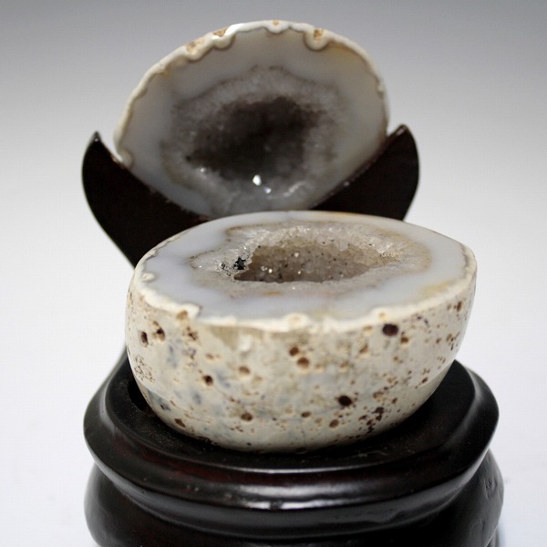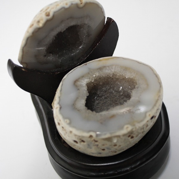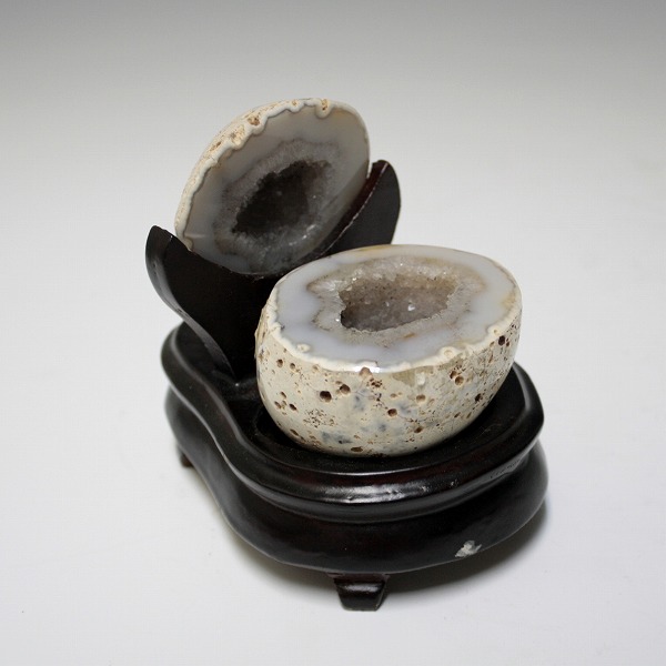 メノウの原石を2つに切ったもので、中には天然の水晶結晶等がきれいに並んでいます。良い気を集めて、パワーを蓄積するといわれています。