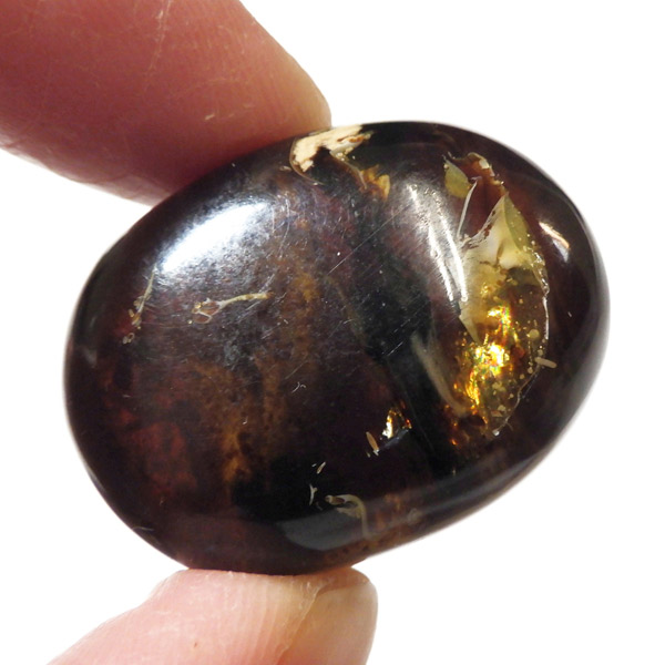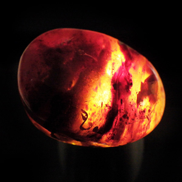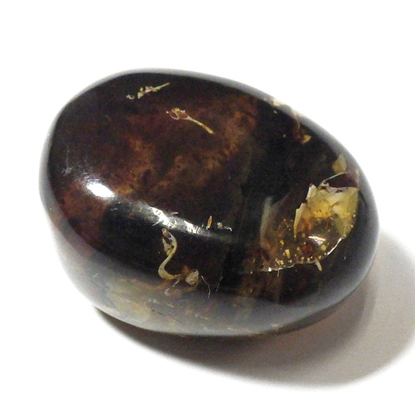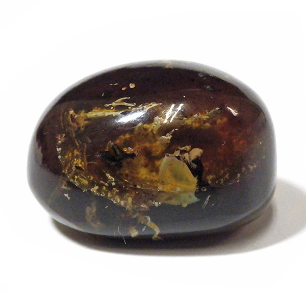 インドネシア産のアンバー(琥珀)、タンブルです。 松柏類の樹脂が3000万年以上の時を経て化石化したものです。 アンバーという名前は、古代アラビア語の「アンバール(海に漂うもの)」が由来です。インドネシアのスマトラで採取されるアンバーは石炭層の中から採れるのが特徴で、落ち着いた色合いのものが多いです。ブランデーのような深い色合いのアンバー内に斑点に似た濃い色の部分が見られます。スマトラアンバーは白熱光の下では赤みがかった色合いを示し、ブラックライトなどを使い、紫外線の下では青い蛍光を示す光学的特徴も持っています。色が綺麗なことはもちろん光を通しても綺麗で美しいです。