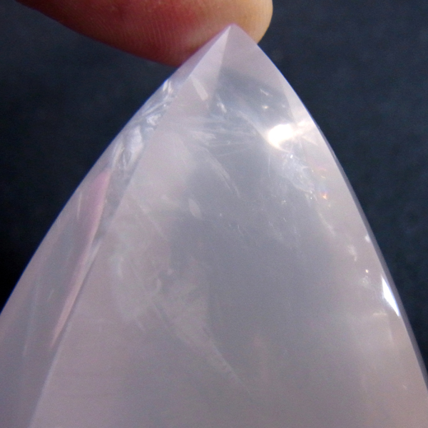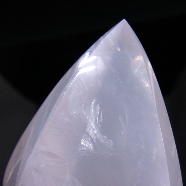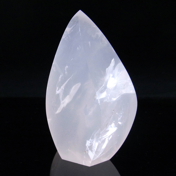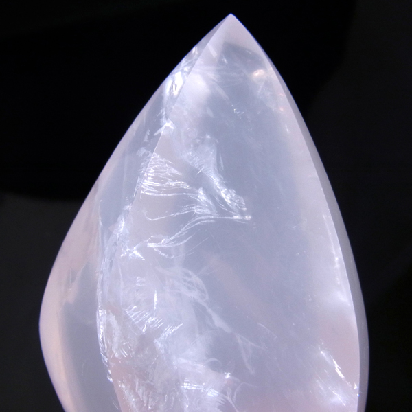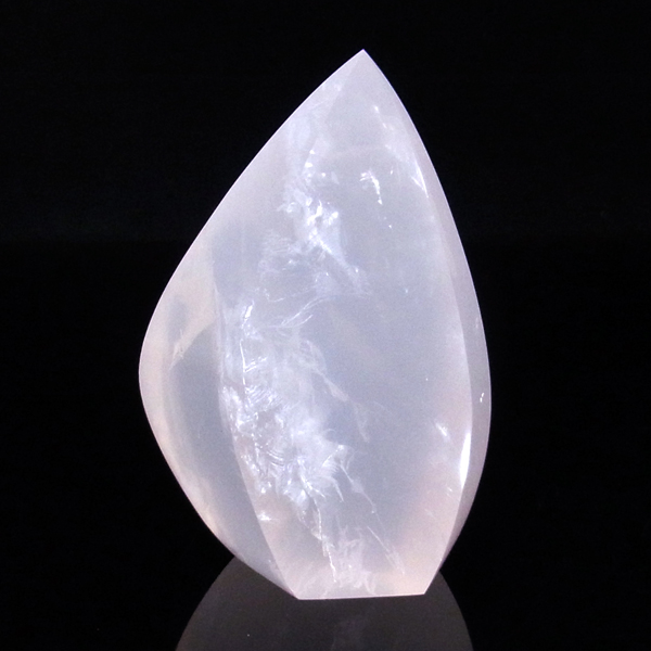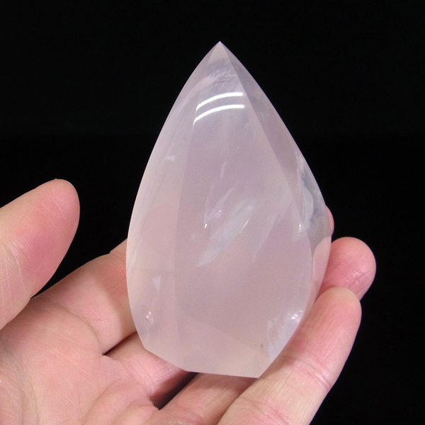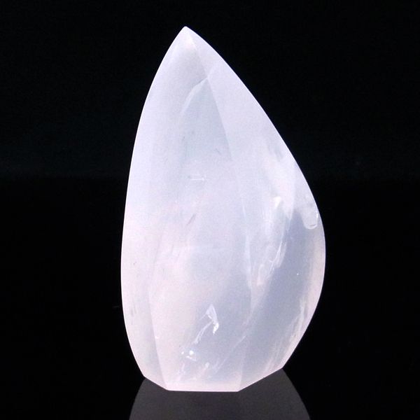 ブラジル産のローズクォーツ、フリーフォーム研磨ポイントです。色はミルキーピンクホワイトの優しい色です。 フリーフォームといって通常のポイントの六角柱ではなく、曲線美のある丸く優しい感じのポイントに磨かれています。丁寧に磨き上げられているため全表面滑らかな状態です。自動研磨ではなく、職人の高い技術の研磨が施されています。キュートな形なので恋愛運アップとともにお部屋のインテリアにも最適です。