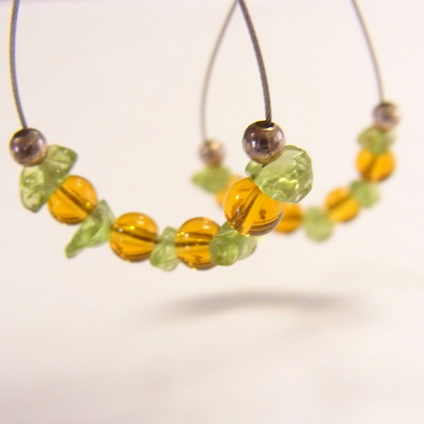 ペリドットのさざれビーズとアンバーでまとめた明るさがかわいいオリジナルピアスです。