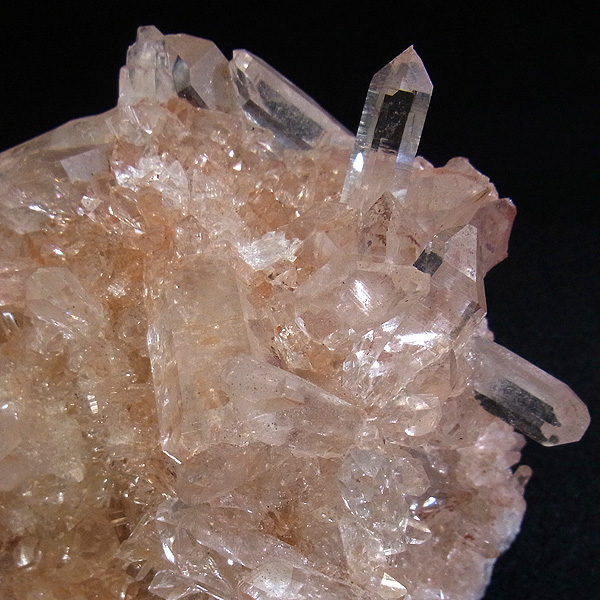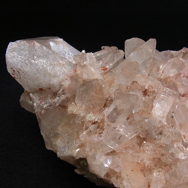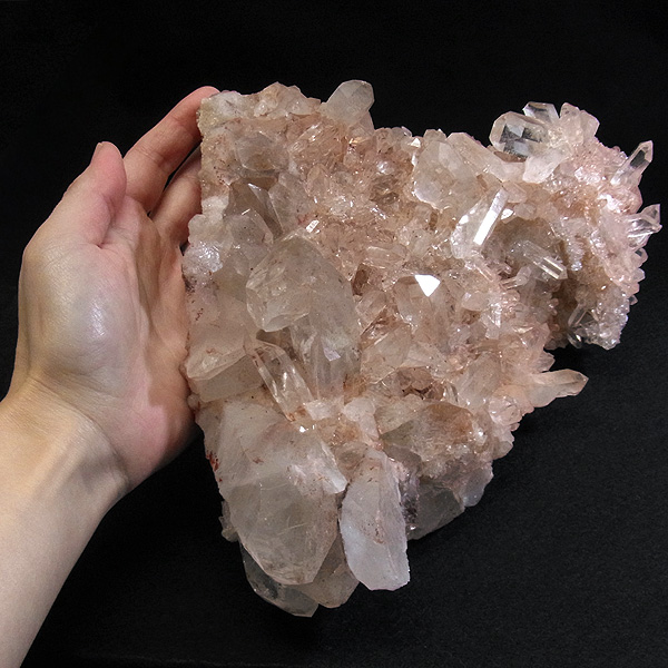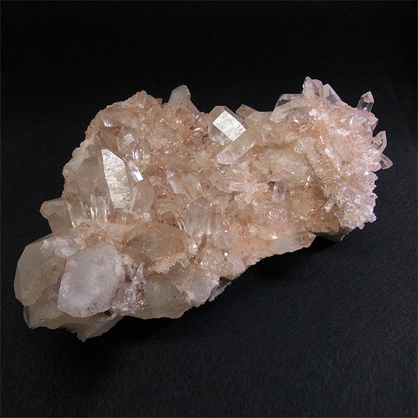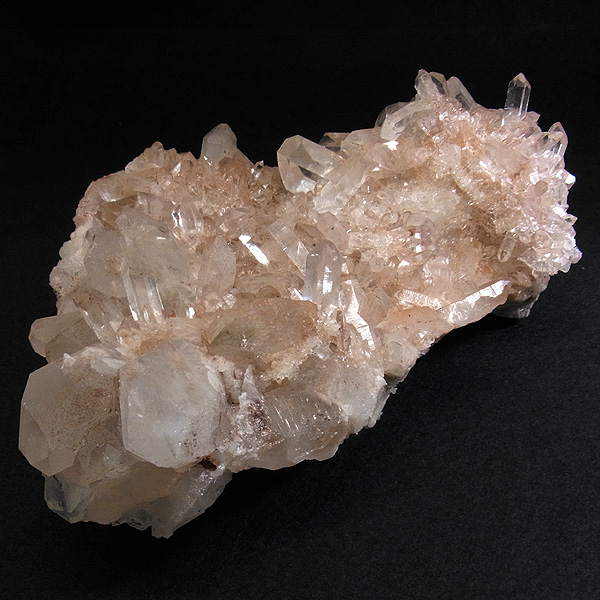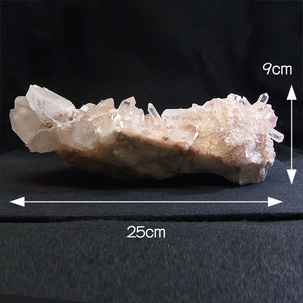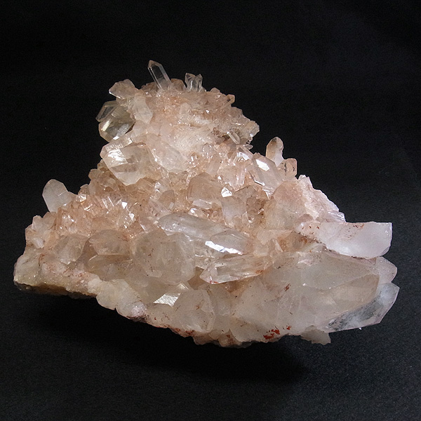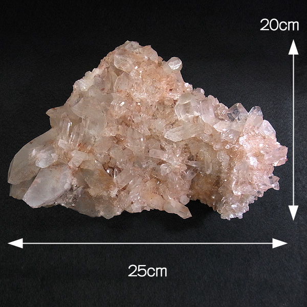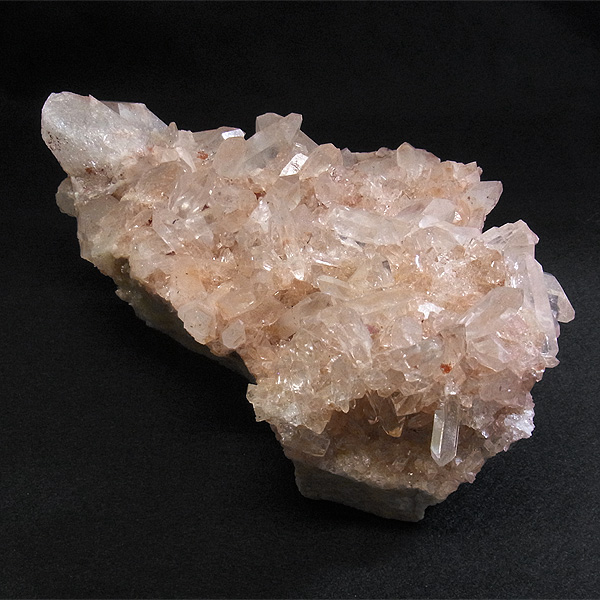 インドのヒマラヤ産の水晶クラスターです。 美しい透明感の中にほのかに淡いピンク色があるのが魅力的な水晶です。 この地で採掘される水晶には表面がピンク色をしたものがよく見られます。 ピンク色の水晶といえばローズクォーツが有名ですが、それとは別で土壌に含まれる赤褐色をした酸化鉄により表面や母岩部がピンク色になっています。 ほんのりと淡いピンク色や濃いピンク色、オレンジがかったピンク色などそれぞれ微妙に色合いも違います。
