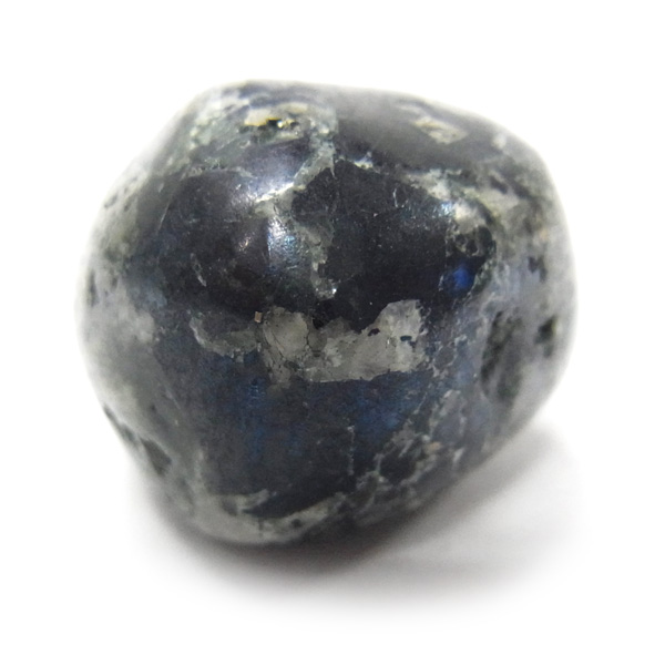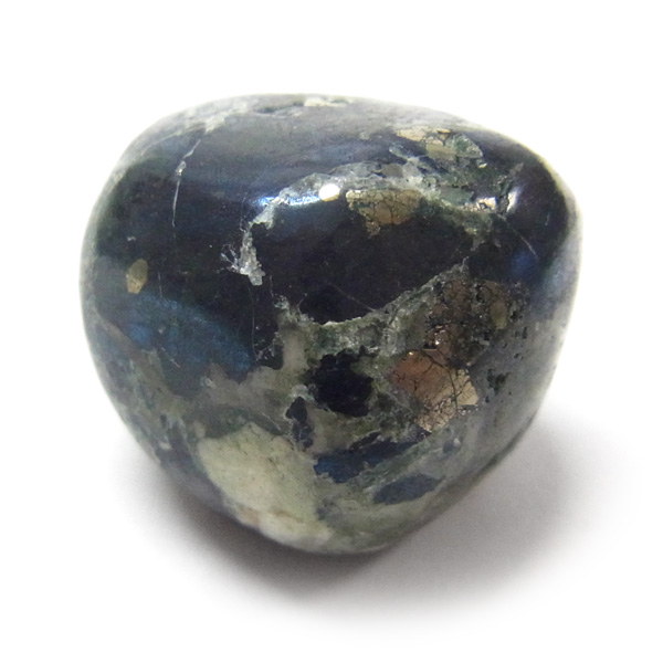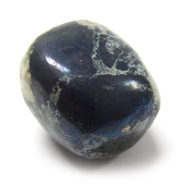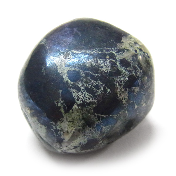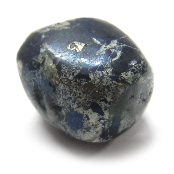 ペルー産のコベライト、タンブルです。コベライトは銅鉱床の上部にできる鉱物で、66%もの銅を含んでいます。パイライトから変化したものが多く、表面はコベライトでも、割ってみると中からパイライトが顔を覗かせることがあります。銅を含む鉱物は、マラカイトなど緑色をしたものが一番多いのですが、コベライトやアズライトのように藍色に発色するものもあります。青く輝く金属光沢がかっこよく、とても魅力的な鉱物です。