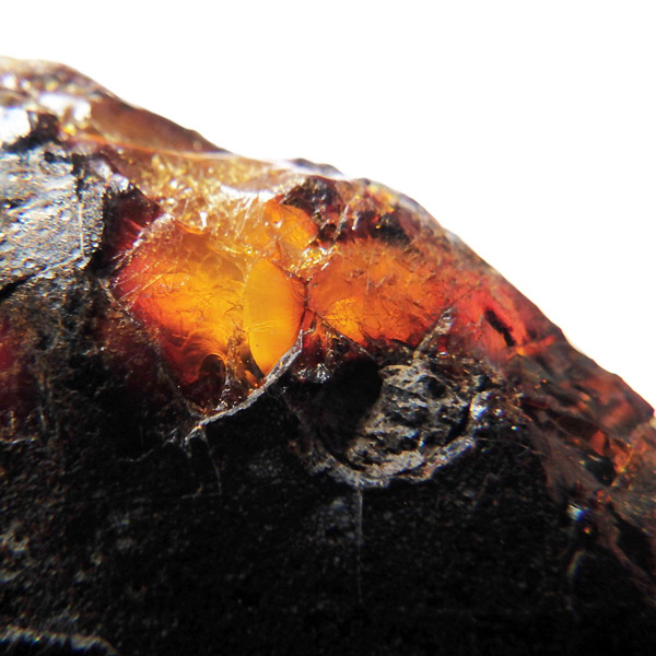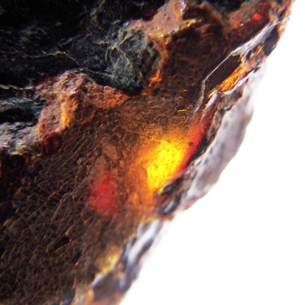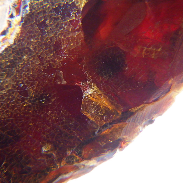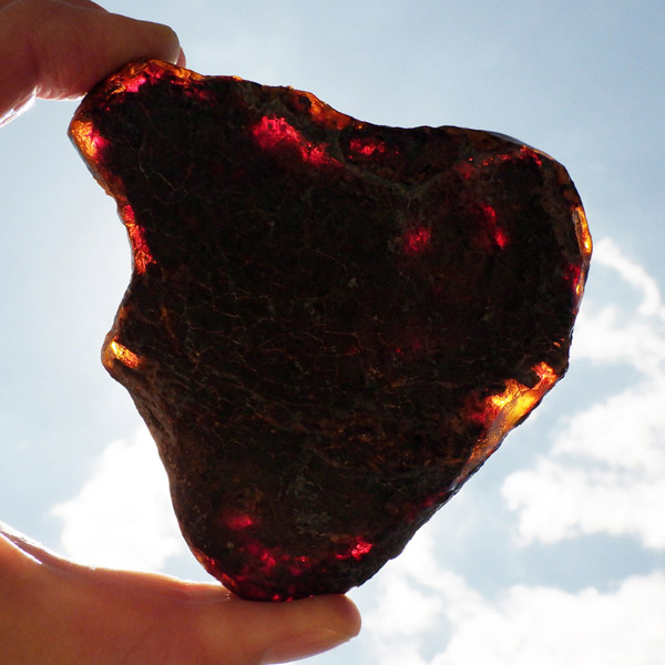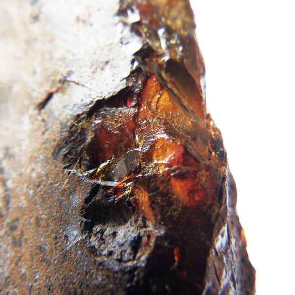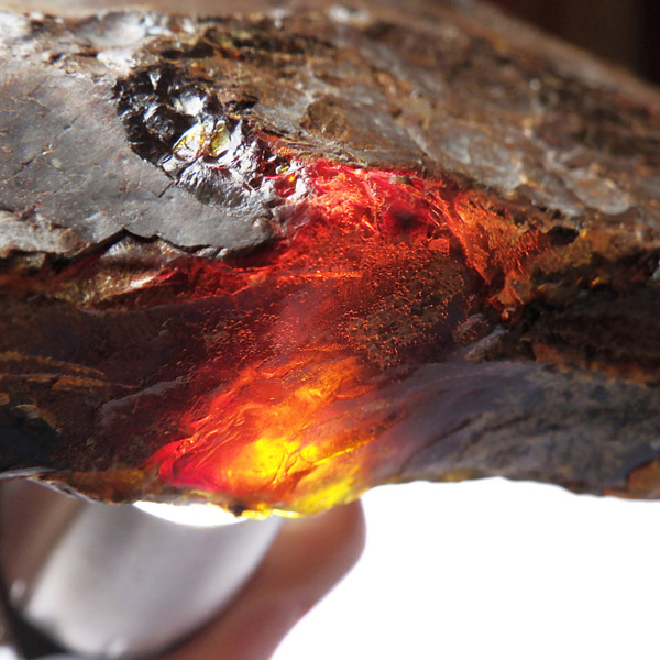 ミャンマー産のレッドアンバー(琥珀)、未研磨原石です。 松柏類の樹脂が3000万年以上の時を経て化石化したものです。 アンバーという名前は、古代アラビア語の「アンバール(海に漂うもの)」が由来です。光を通すと大部分に赤い光を透過させています。ブラックライトなどを使い、紫外線の下では青い蛍光を示す光学的特徴も持っています。琥珀自体貴重な石ですが、その中でも天然の赤い琥珀は大変貴重です。