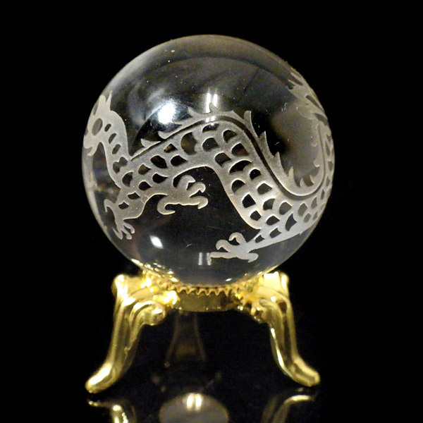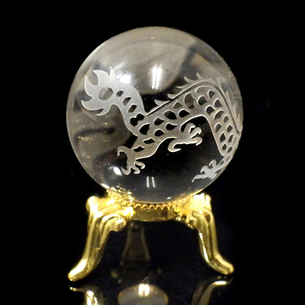 龍彫り水晶球 31mm スフィア 丸玉 彫り物 金属台付き