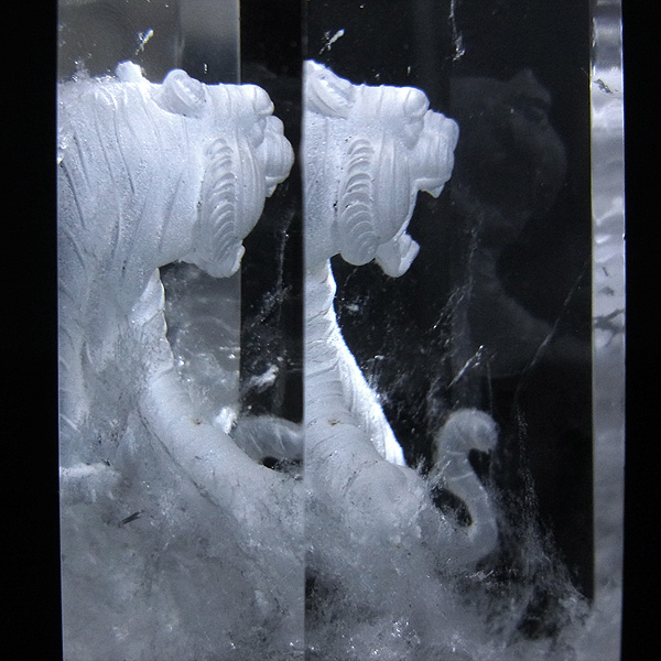 水晶に元々あった結晶を活かし、虎が岩の上で雄叫びを上げている様子を立体的に見事に表現しています。顔の表情や毛並みまで。大変細かく彫られており、この大きさでも圧倒されます。