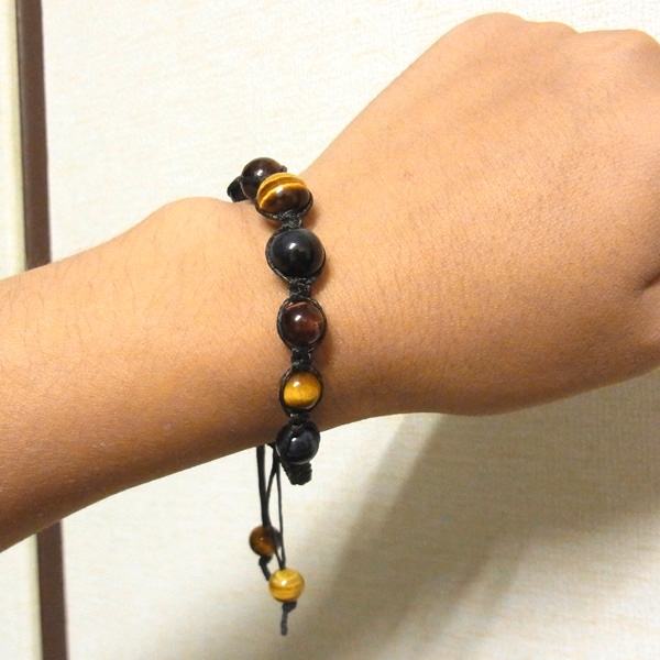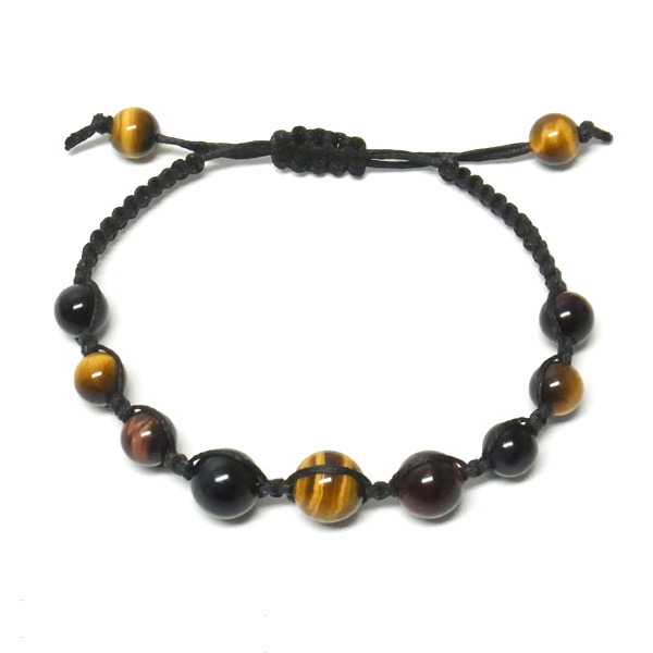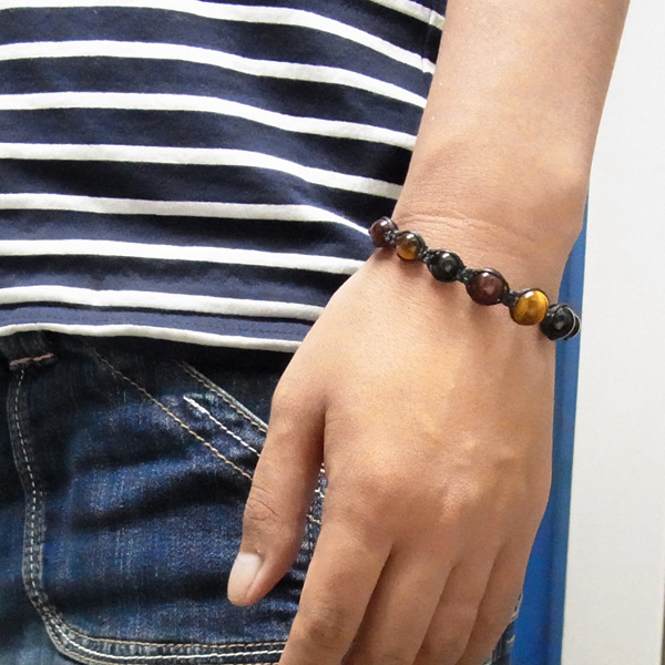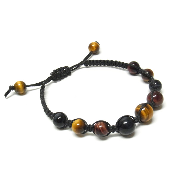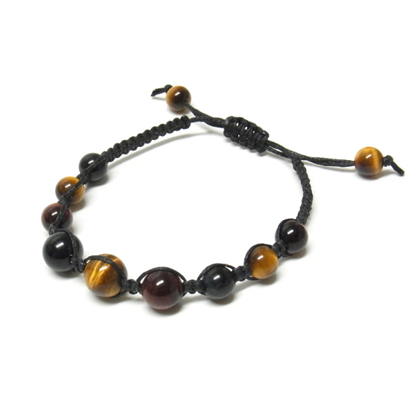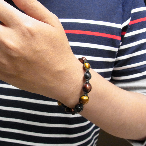 三色タイガーアイともいわれるタイガーアイ、レッドタイガーアイ、ホークスアイの編み込みブレスレットです。タイガーアイは、クロシドライト(青石綿)の状態のものを鷹目石(ホークスアイ)、その鉄分が酸化して黄色になると虎目石(タイガーアイ)、さらに酸化が進むと赤虎目石(レッドタイガーアイ)になります。※ホークスアイは別名ブルータイガーアイと呼ばれています。虎の目のような輝きが特徴的。サイズはアジャスターで調整可能。シックな色味がかっこいいブレスレットです。