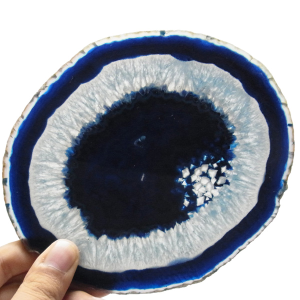 染色することにより、色の濃淡ができ、メノウの縞模様がより一層美しくなります。置物を置いたり、鉱物を置いたりのインテリアとしてや、グラスなどを置くコースターとしてもお楽しみ頂けます。