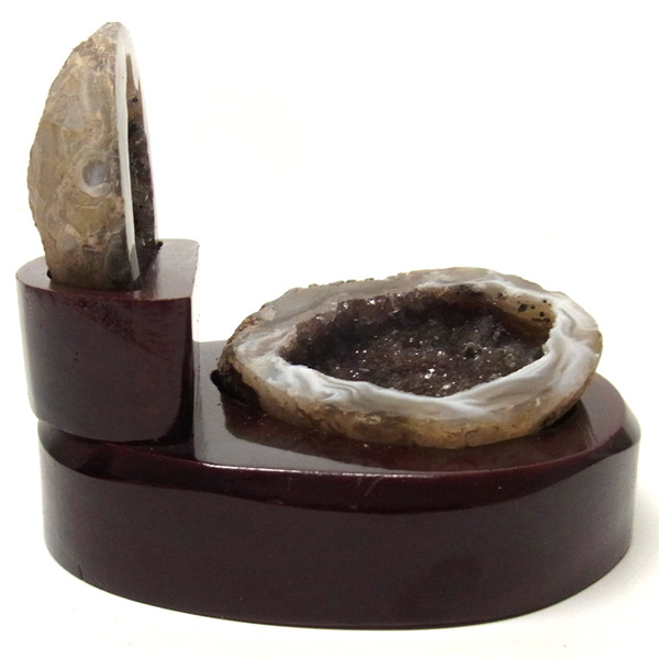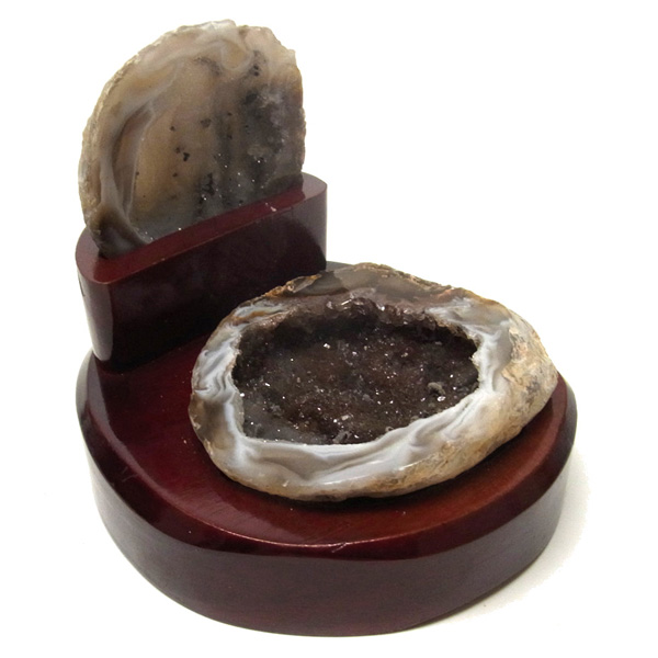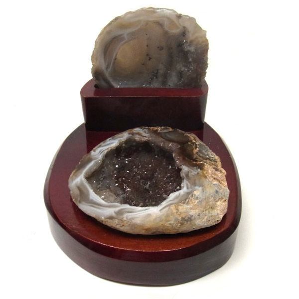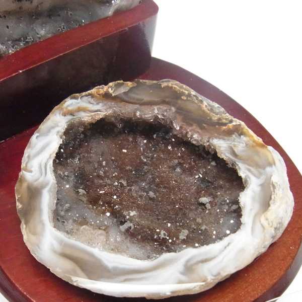 メノウの原石を2つに切ったもので、中には天然の水晶結晶等がきれいに並んでいます。良い気を集めて、パワーを蓄積するといわれています。