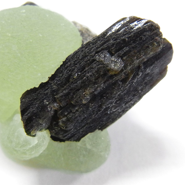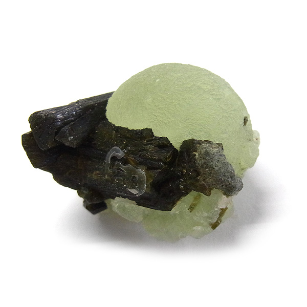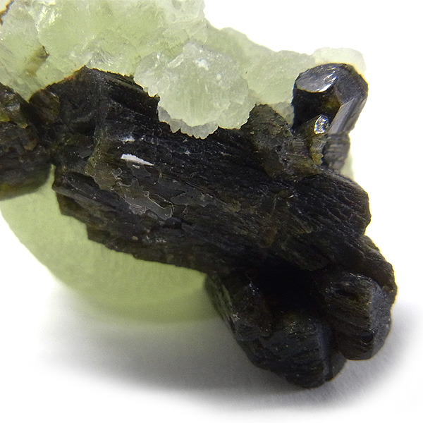 母岩にはプレナイトの内包物として良く見られる、トルマリンのような黒っぽい針柱状の鉱物、エピドート(緑簾石)が共生しています。