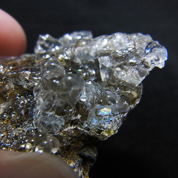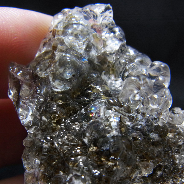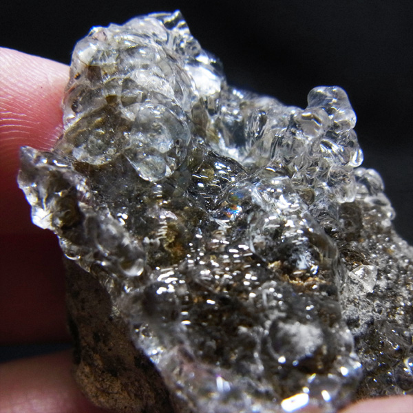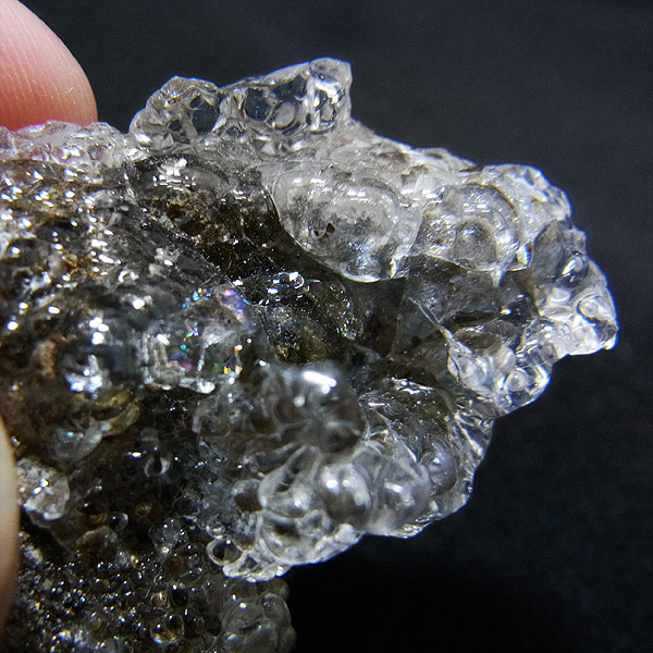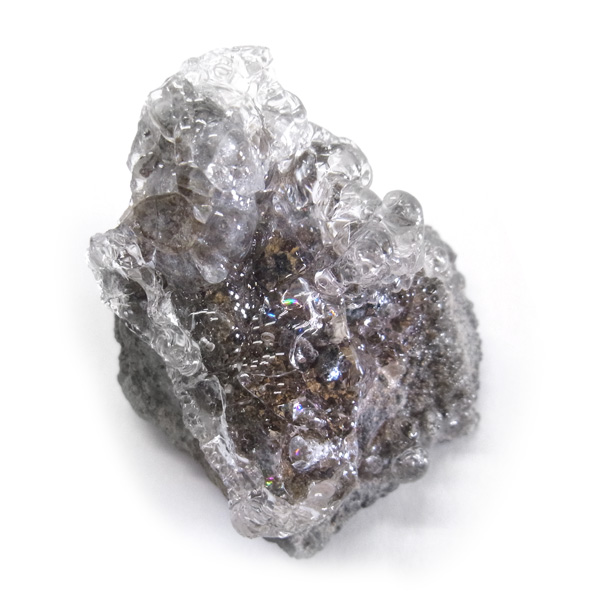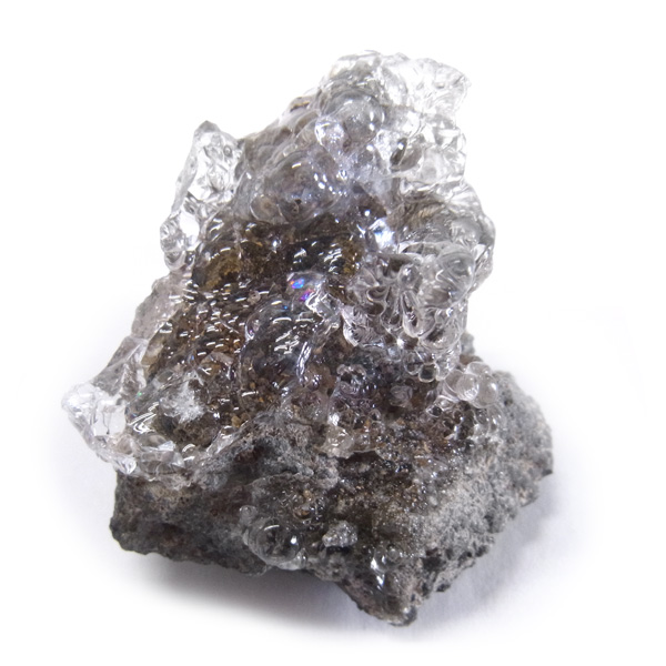 ハイアライトの和名は「玉滴石(ぎょくてきせき)」で、別名「グラスオパール」とも呼ばれているように、最も透明度の高い「オパール」の一種です。地下水に溶けた二酸化ケイ素が常温で、無色透明で粒状やブドウ状の、まさに水滴のように固まってできた天然鉱物です。
