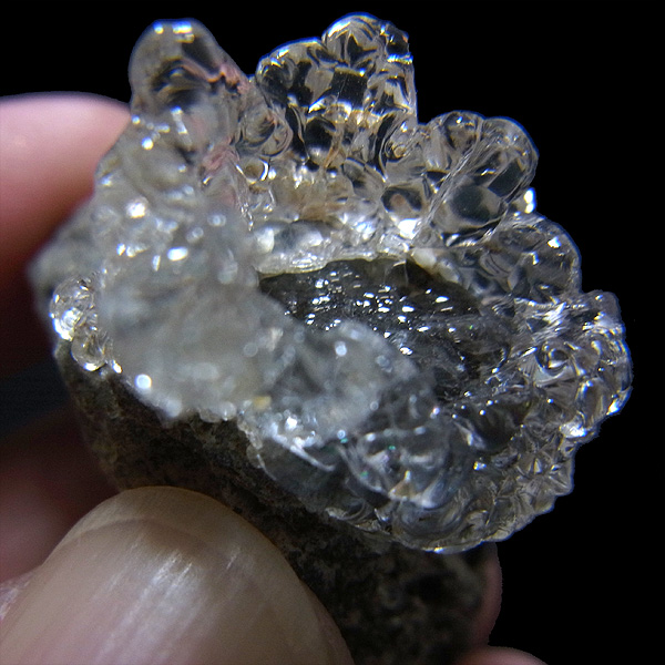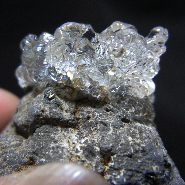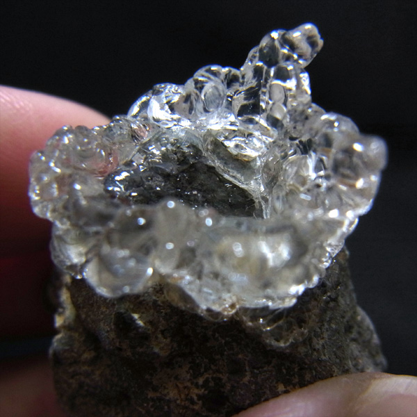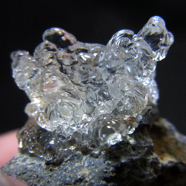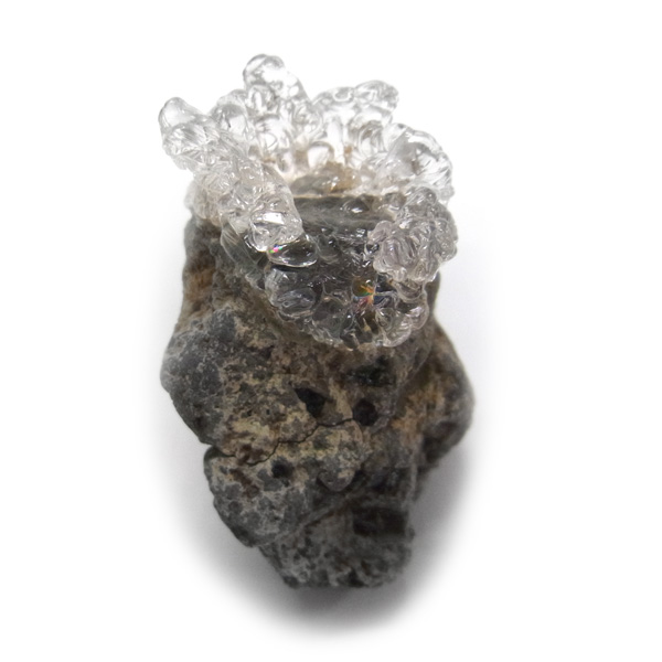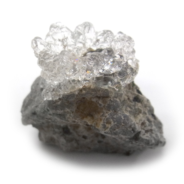 ハイアライトの和名は「玉滴石(ぎょくてきせき)」で、別名「グラスオパール」とも呼ばれているように、最も透明度の高い「オパール」の一種です。地下水に溶けた二酸化ケイ素が常温で、無色透明で粒状やブドウ状の、まさに水滴のように固まってできた天然鉱物です。