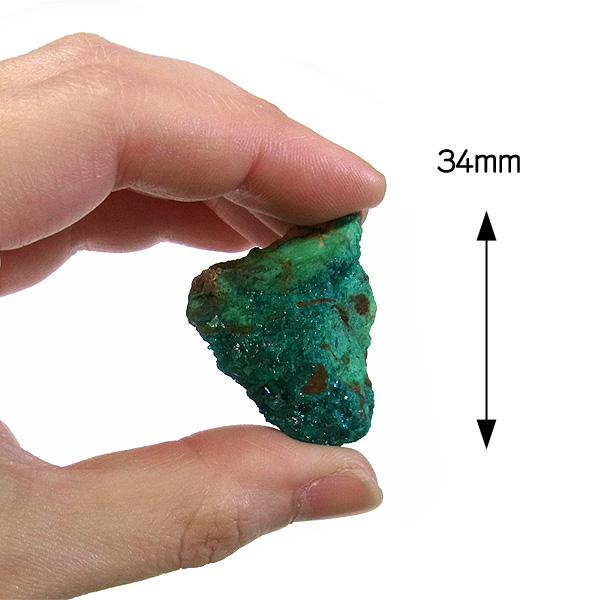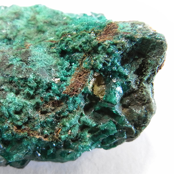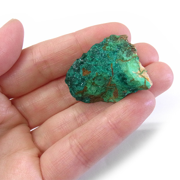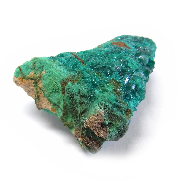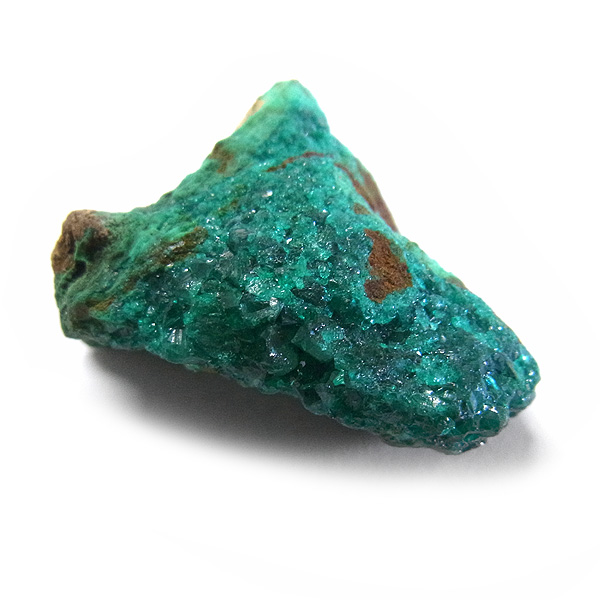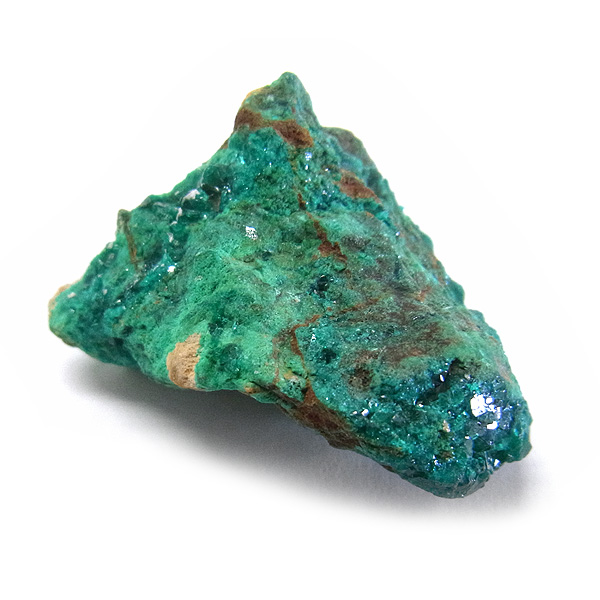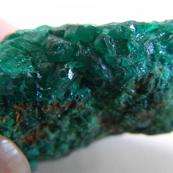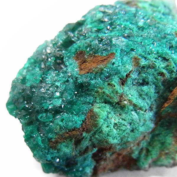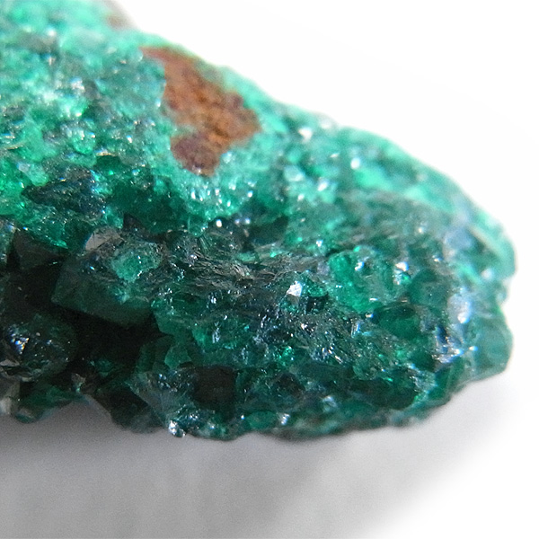 コンゴ産のダイオプテーズ原石です。ダイオプテーズは、美しい翠緑色が魅力的な石です。1785年に最初にカザフスタンで発見され、とても深く鮮やかなグリーンが特徴で、当時はエメラルドと間違われました。その後、エメラルドと成分が異なることが確認され、ダイオプテーズと名づけられました。銅にまつわる副産物で、ダイオプテーズそのものでも希少性が高く、高価な鉱物です。