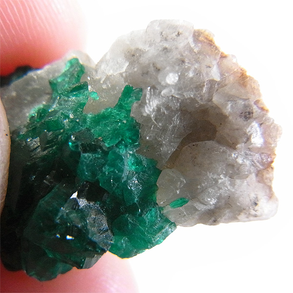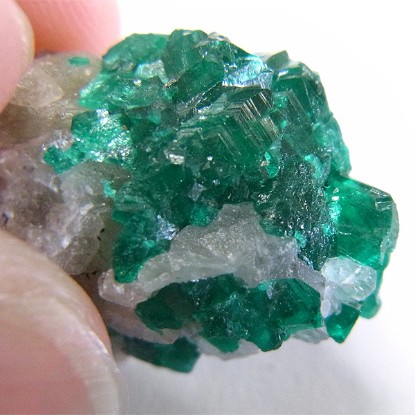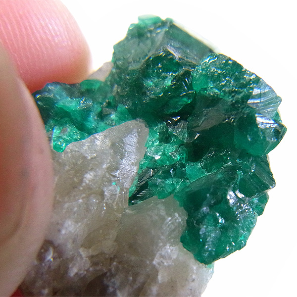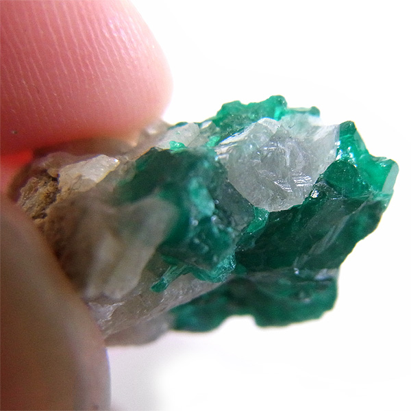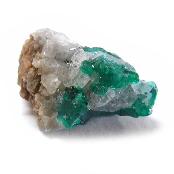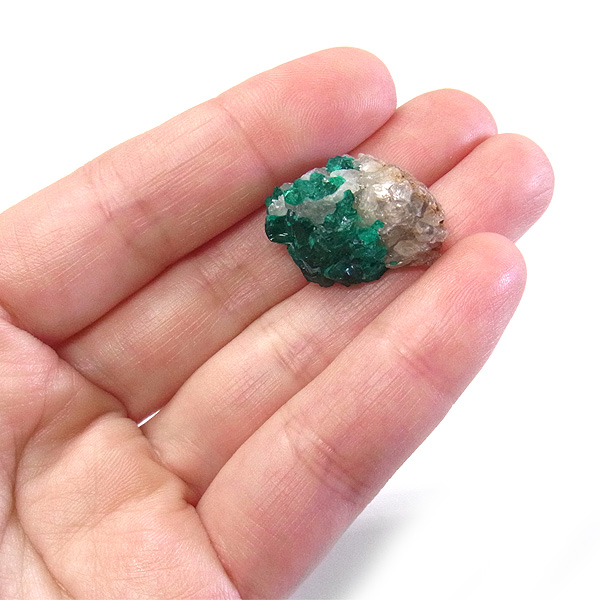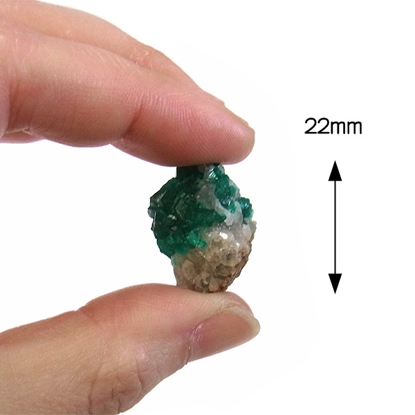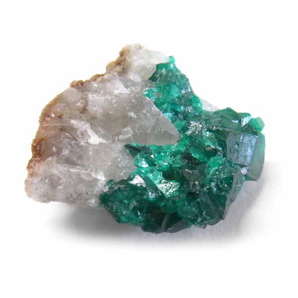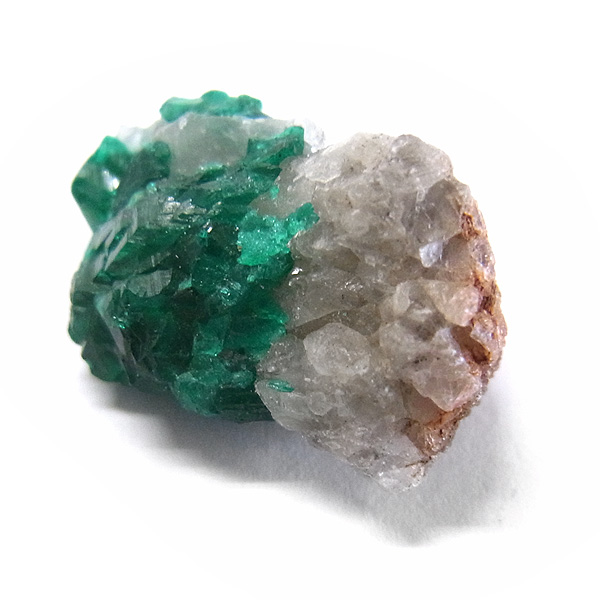 コンゴ産のダイオプテーズ原石です。ダイオプテーズは、美しい翠緑色が魅力的な石です。1785年に最初にカザフスタンで発見され、とても深く鮮やかなグリーンが特徴で、当時はエメラルドと間違われました。その後、エメラルドと成分が異なることが確認され、ダイオプテーズと名づけられました。銅にまつわる副産物で、ダイオプテーズそのものでも希少性が高く、高価な鉱物です。