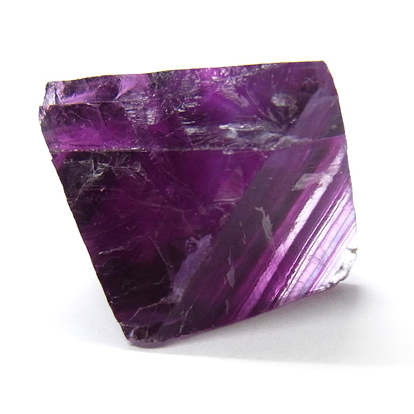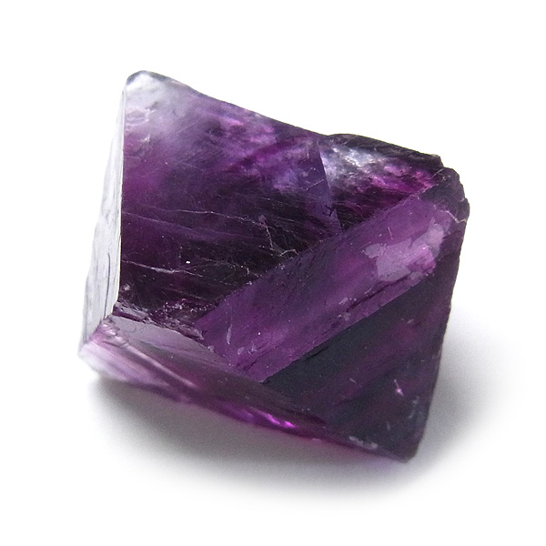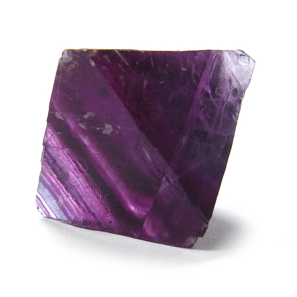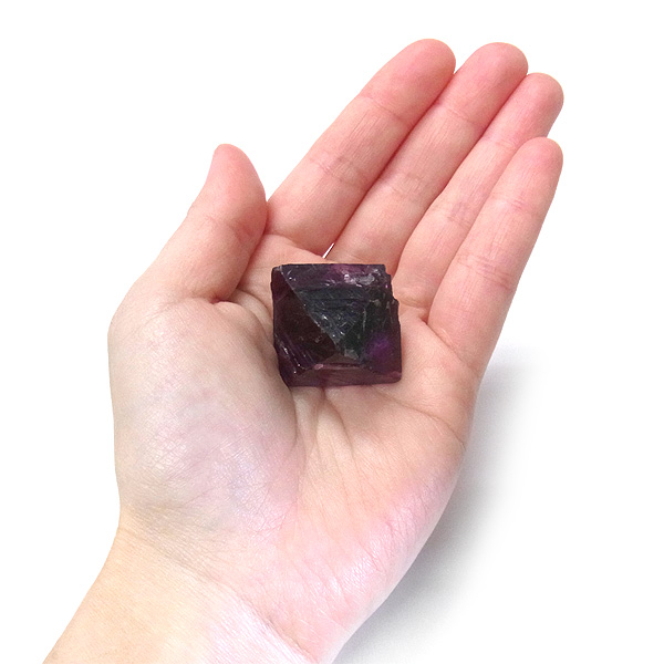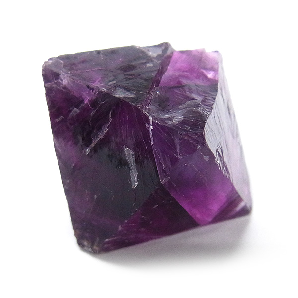 この正八面体の形は、蛍石が平面に平行に割れやすい性質を利用して加工したものです。発色の良い高品質で大きさも大きいサイズで、光に透かすと一層の美しさが現れます。