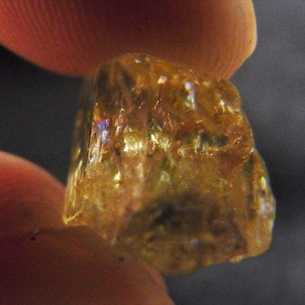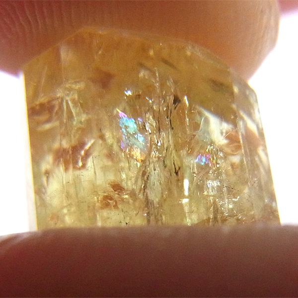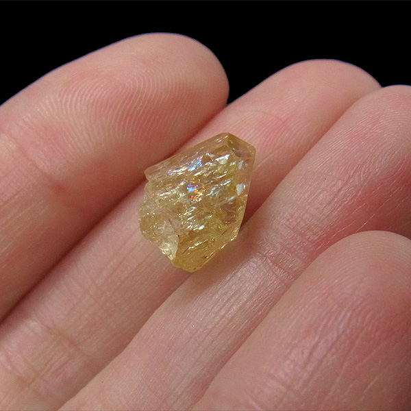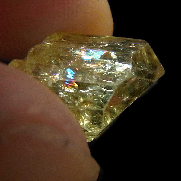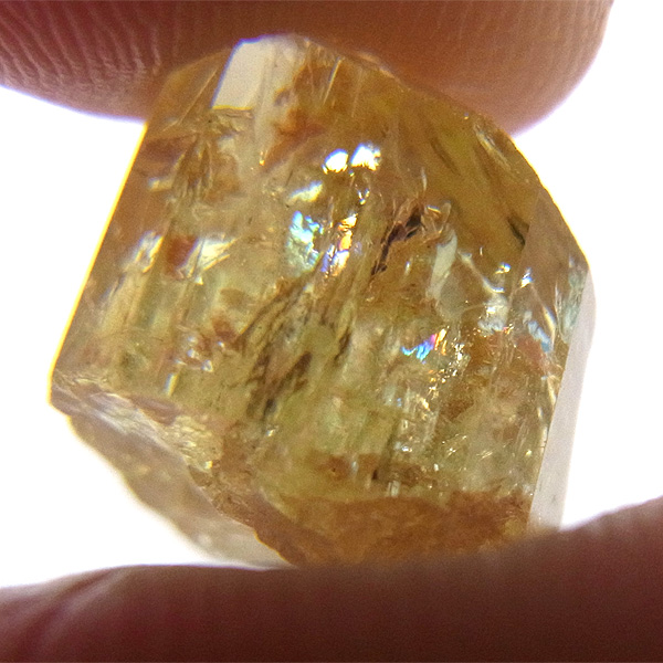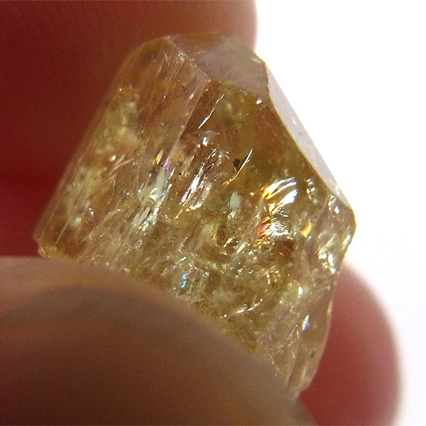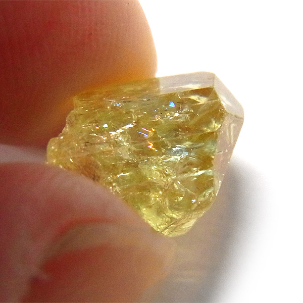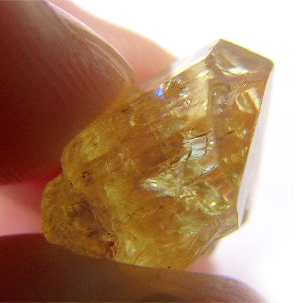 メキシコ産のイエローアパタイト原石です。加工すれば宝石になるようなきれいな原石です。結晶は透明でしっかりとしたイエローカラー、角度によってはキラりとレインボーが輝きます。とても高品質で貴重な一点です。