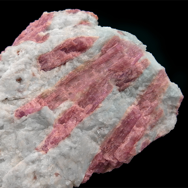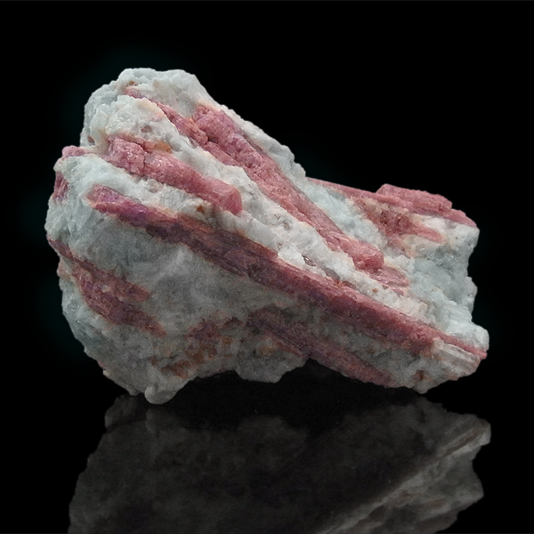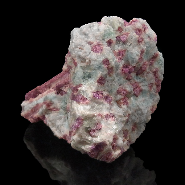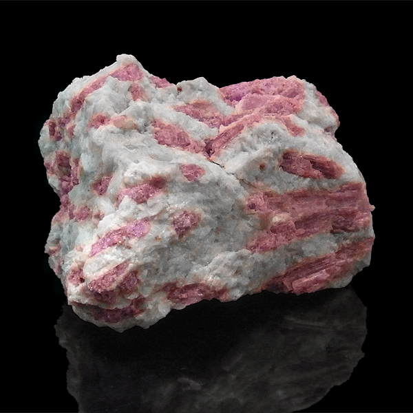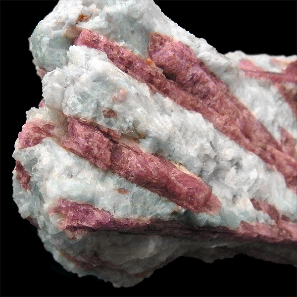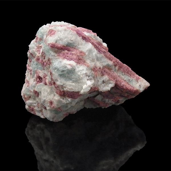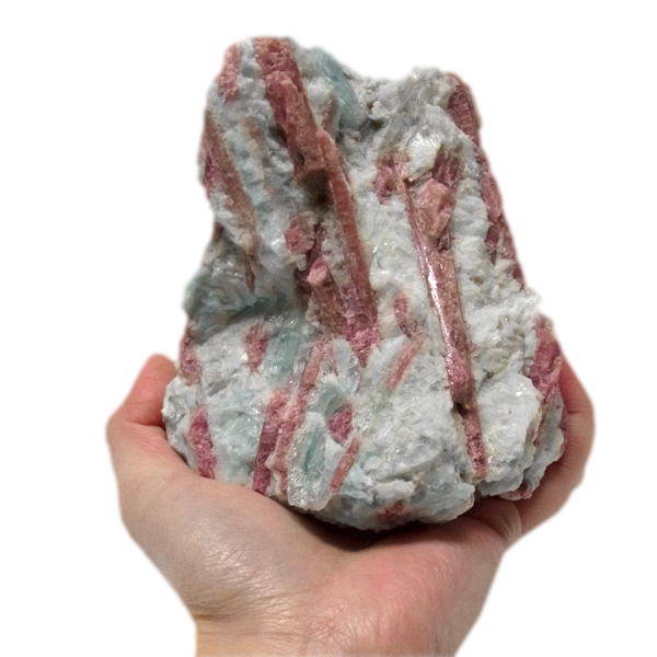 赤色の発色は、マンガンやイオンによるもので、マンガンの含有量が少ないと淡いピンクになり、ピンクトルマリンとなります。ピンクトルマリンの綺麗さに加え、アクアマリンのアクセントがあり、とても見ごたえのある原石です。