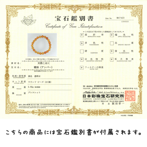 アンバーは心身共に不快な状態や症状の軽減にも有益で、生きる事に対する前向きな喜びを高めてくれる力もあります。また、アンバーはエネルギー的に余分なものを抜くだけではなく、緊張する場面や肩の力が入りがちな場面において、緊張を解きほぐしリラックスして最大の力を発揮しやすくする為にとても有益な石でもあります。 その為、受験や勝負のお守りとして、更に出産時等にもお守りとしてとてもオススメです。