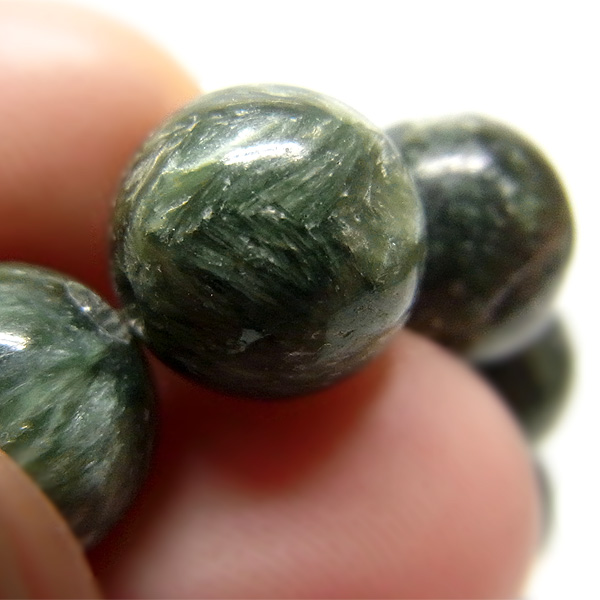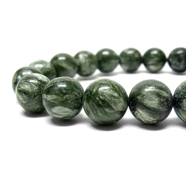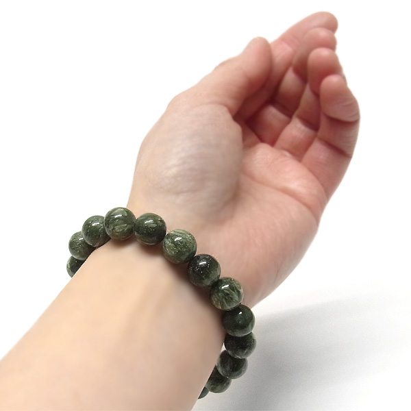 美しいグリーンを持つセラフィナイトのブレスレットです。色の濃淡が大変美しく、濃いグリーンの部分から白い羽根が舞い落ちるような模様になっています。角度によって輝きが変化するシルバーの雲母もこのセラフィナイトの美しさを引き立てています。【 セラフィナイトの意味・効果】