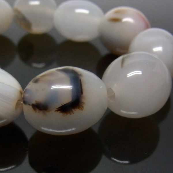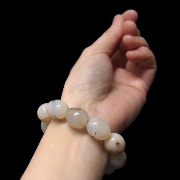メノウのタンブルブレスレットです。大きなメノウの玉を磨いたビーズを使ったブレスレットです。石が腕にあたる面積が多く、ひんやりと冷たい石の質感を感じられます。色はホワイト~オレンジと様々な表情を見せてくれます。天然石ならではの、オリジナルの模様も魅力の一つです。