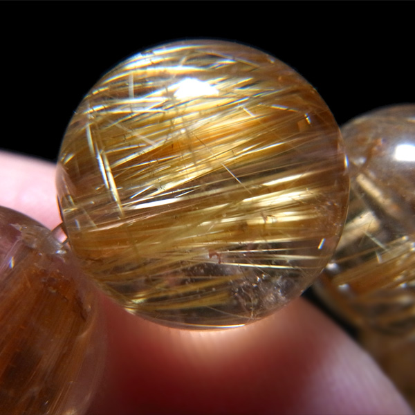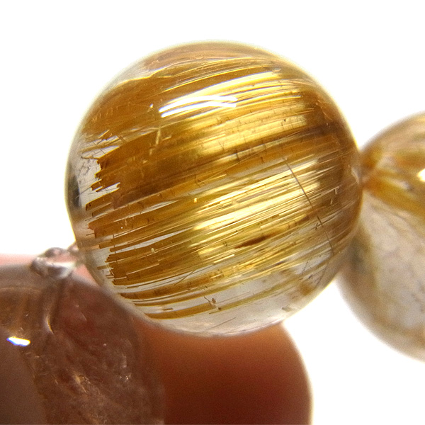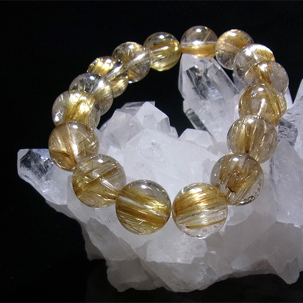 ゴールデンルチルに比べ、タイチンルチルはルチルが板状、束状に太く、その太い針のものをを取り揃えるのは大変困難になります。ですので、希少価値も大変高くなるのです。本商品は、しっかりとした太い針がはいっており、また、13mm玉と大きいので、大変存在感のある一品となります。