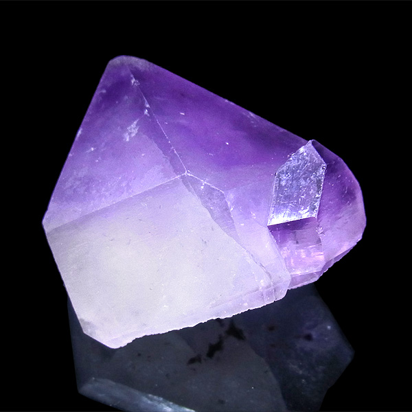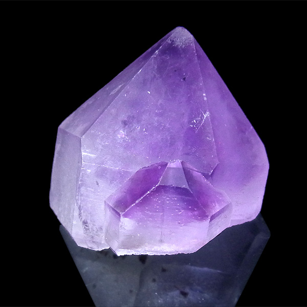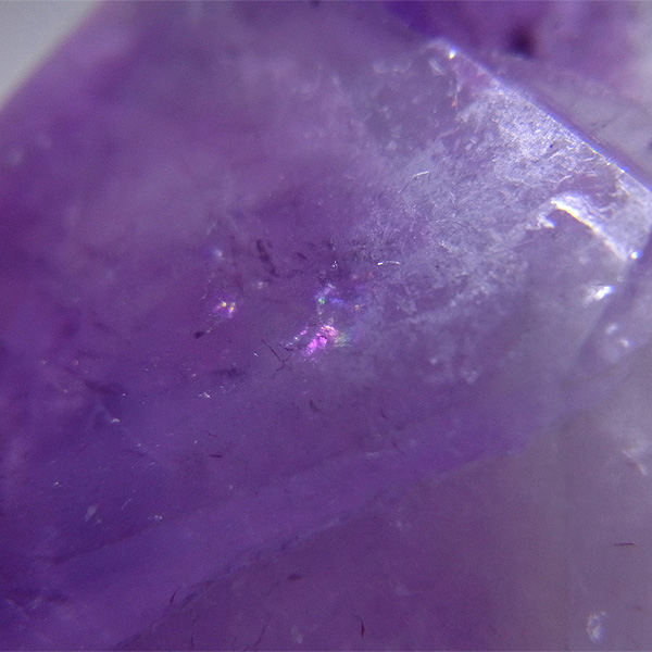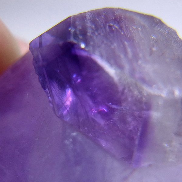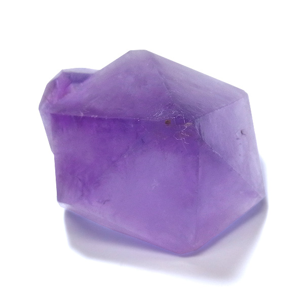 大きなポイントのアメジストです。太くて背が低く、寸動な形が特徴です。この、ふきのとうのような佇まいが大変愛らしく、心が和みます。下から上へのグラデーションも大変綺麗で、先端はかなり濃い紫色をしています。随所にレインボーも見られ、色々な表情を見せてくれます。