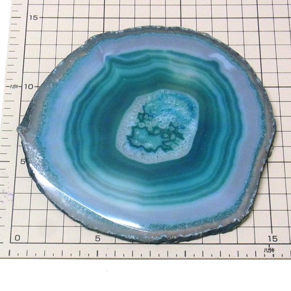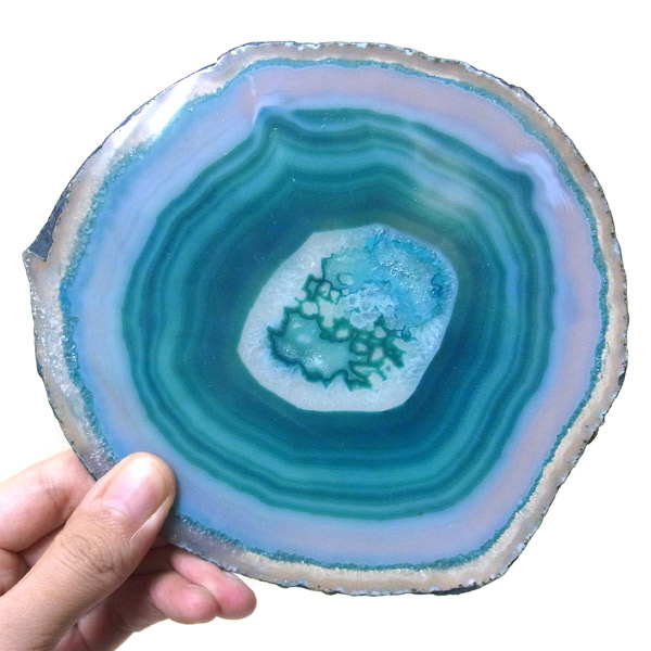 ブラジル産メノウを染色し、薄くスライスした色鮮やかなメノウスライスです。 カラーはブルーグリーン、大きさは特大サイズです。