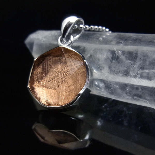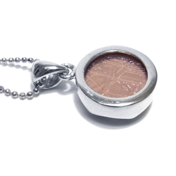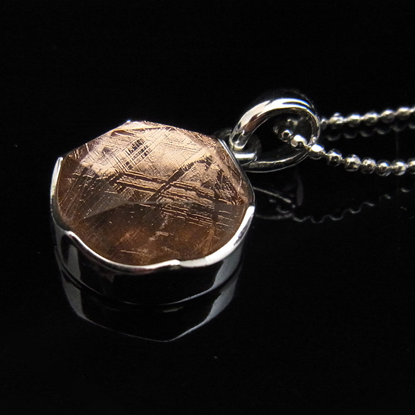 ギベオン隕石(メテオライト)とは現在のナミビア・ハルダプ州に約4億5千万年前に地球に落下した鉄隕石です。 このギベオン隕石の特徴はウィドマンシュテッテン構造と呼ばれている細かい網目模様です。 これは鉄とニッケルの合金を加熱融解した後に極めてゆっくりと冷却した場合に、約900度でニッケルの多い部分と少ない部分に分かれる現象が起こり始めます。 ニッケルの多い部分は酸に溶けにくく、少ない部分は解けやすいという性質を持ちます。 ギベオン隕石を酸処理することにより溶け具合の差が模様となって現れます。 酸による溶け具合の差が生じるためにこのウィドマンシュテッテン構造が形成されます。 冷却速度が遅いほどこの分離過程は進行するため、ウィドマンシュテッテン構造を形成するのには100万年以上の膨大な時間が必要とされています。 この為、人工的に合成することは不可能であると科学的に立証されています。