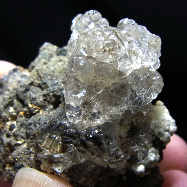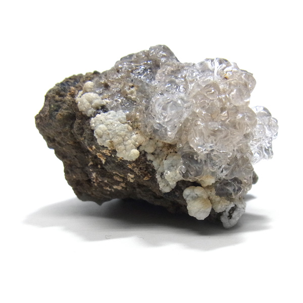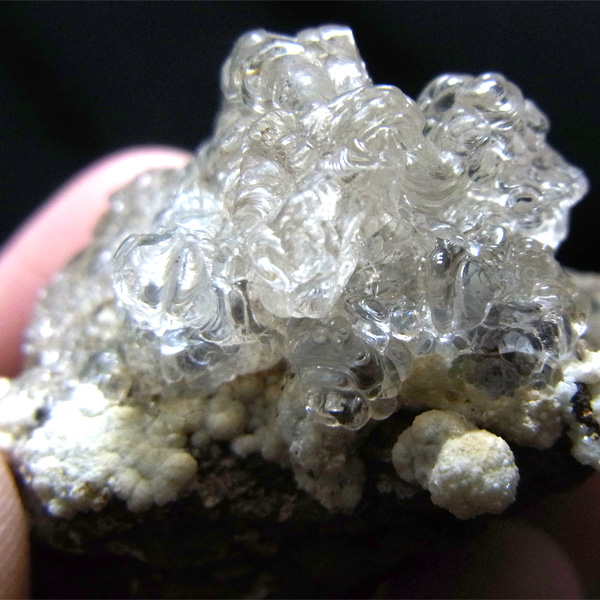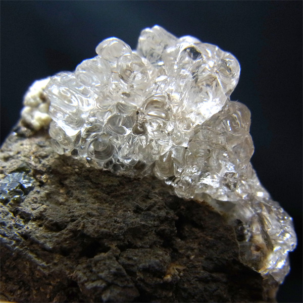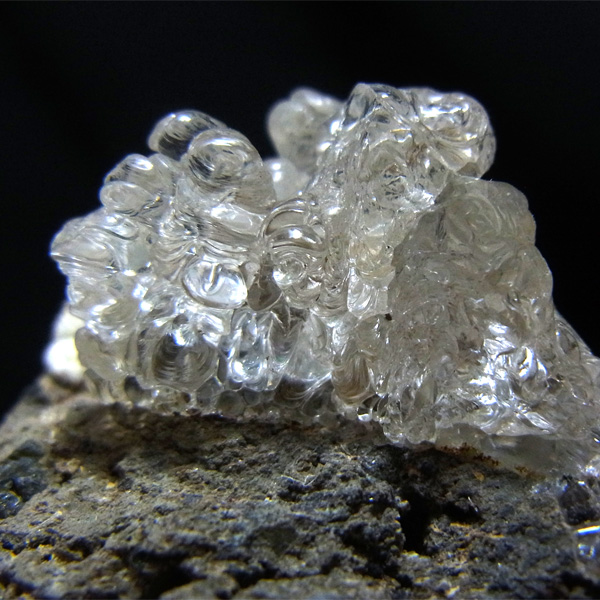 ハイアライトの和名は「玉滴石(ぎょくてきせき)」で、別名「グラスオパール」とも呼ばれているように、最も透明度の高い「オパール」の一種です。地下水に溶けた二酸化ケイ素が常温で、無色透明で粒状やブドウ状の、まさに水滴のように固まってできた天然鉱物です。