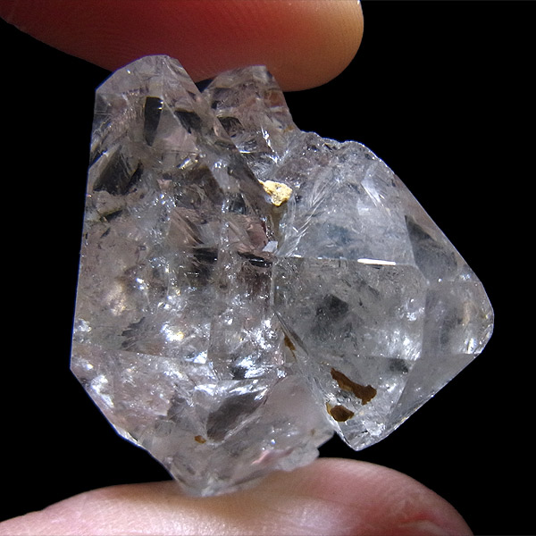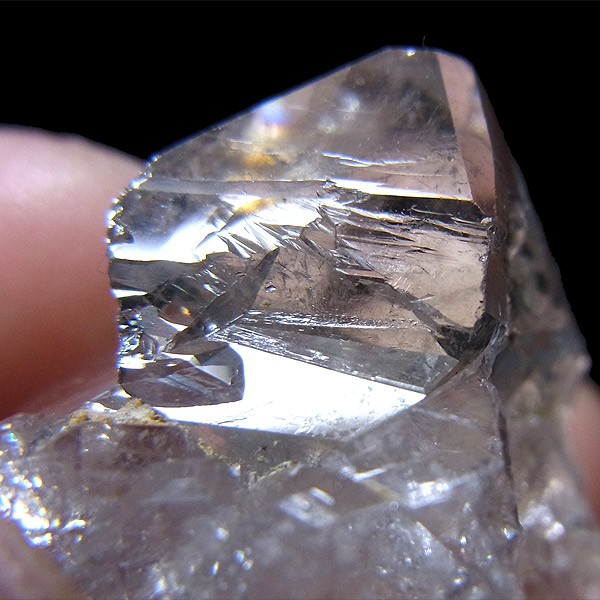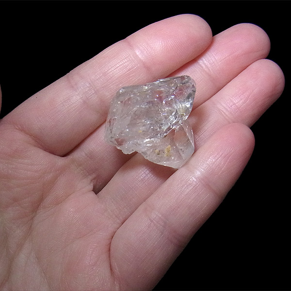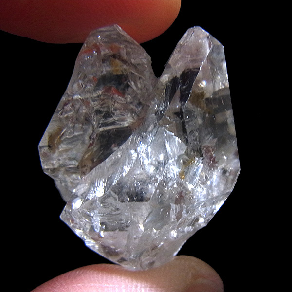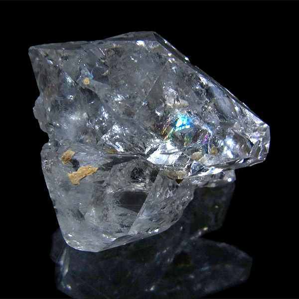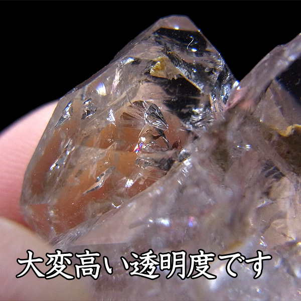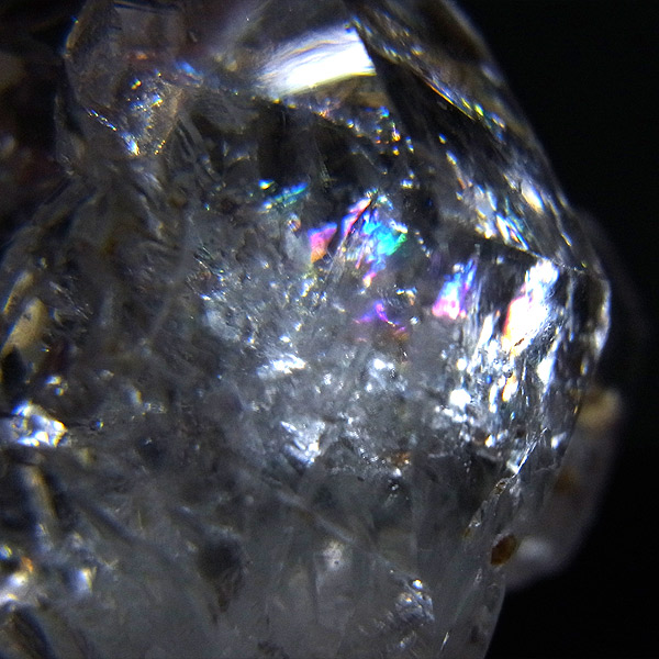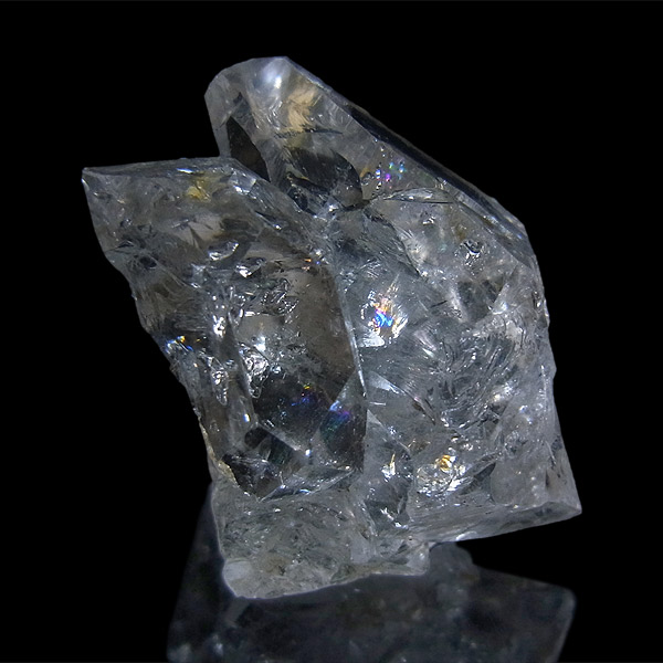 モロッコ産のクォーツは、なかなかキレイな形のものが産出されにくいのですが、今回ご用意したエレスチャル水晶はダブルポイントになっており、まるでハーキマーダイヤモンドのようです。透明度も抜群で、折り重なった部分に光が入って屈折し、きらびやかなレインボーが見られます。