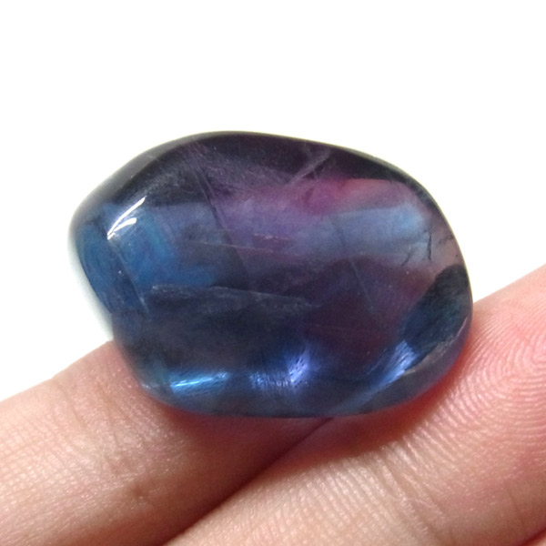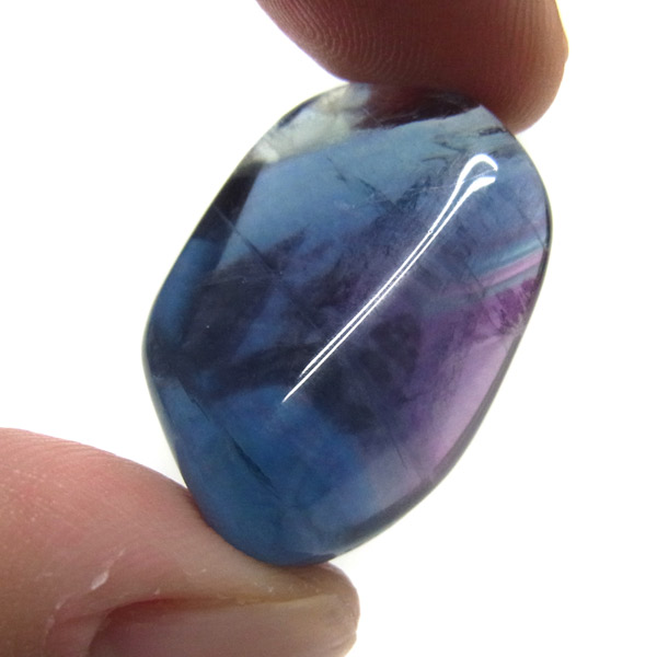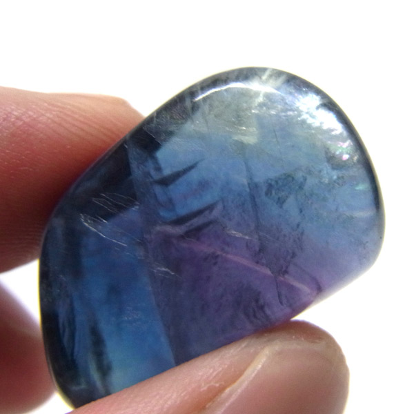 高品質のマルチカラーフローライト、タンブルです。 大変透明度が高く、グリーン、ブルー、パープルのグラデーションも見られます。蛍石の名前の通り、様々な角度からその美しさを楽しむことができます。光にかざして透かすと、カラーが複雑に入り乱れており、そのグラデーションが大変きれいです。