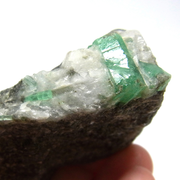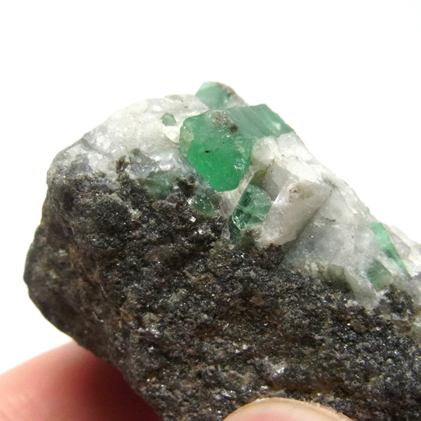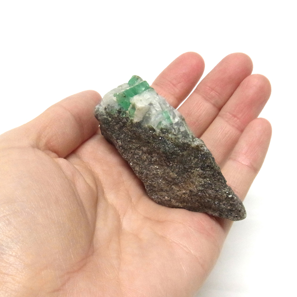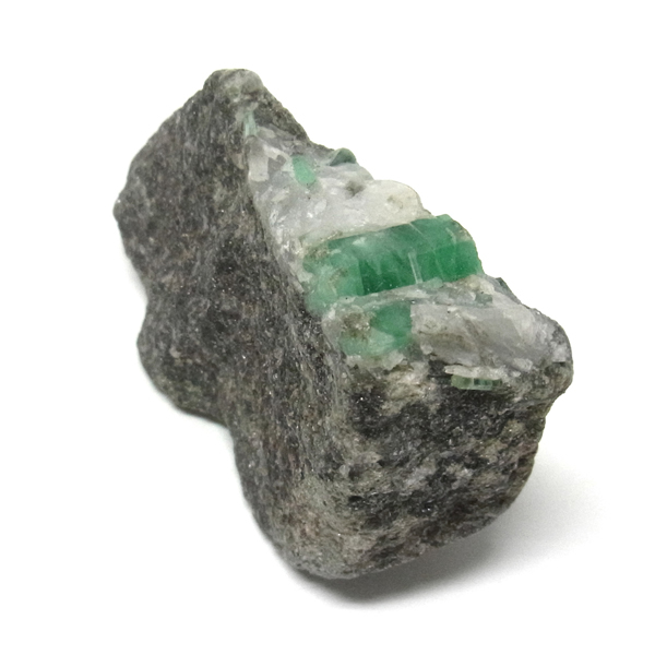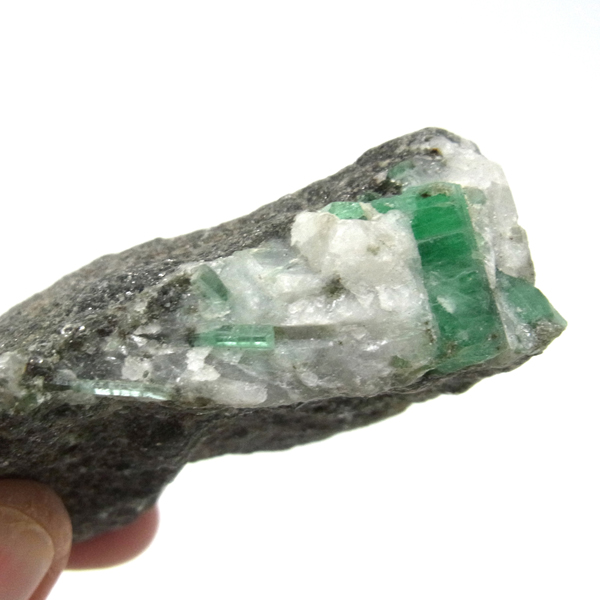 中国雲南省産天然エメラルドの原石です。 ベリル(緑柱石)の一種で緑色になるのもをエメラルドと呼びます。この緑色はクロムもしくはバナジウムによるものです。中国の南、雲南省にはエメラルド鉱山があり、綺麗な緑色をしたエメラルドが産出します。エメラルドグリーンの柱状の結晶がきれいに成長しています。