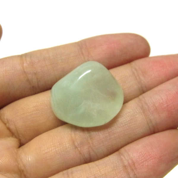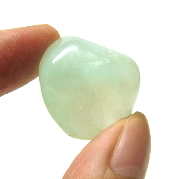 南アフリカ産のプレナイト、タンブルです。プレナイトは、淡い青緑から黄色にかけての色合いの石。1788年に南アフリカで初めてこの石を発見したフォン・プレーン大佐にちなんで名付けられました。葡萄石という和名は産出時に見た目が葡萄のようであったことから名づけられました。今回は黄色味がかったものではなく、発色の良いミルキーな青よりの緑のプレナイトをご用意いたしました。優しい色合いで心が落ち着きます。