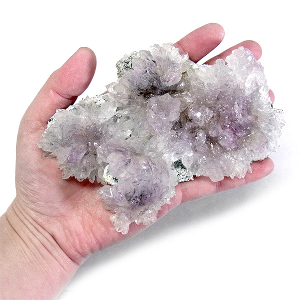 フラワーアメジストとは、アメジストの細かい結晶が折り重なるように成長して、花が開いたように見える石をフラワーアメジストと呼びます。花弁の奥から広がる奥ゆかしい紫色のグラデーションが、とてもきれいで、その形自体が結晶美で見ごたえがあります。