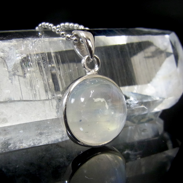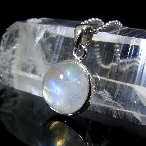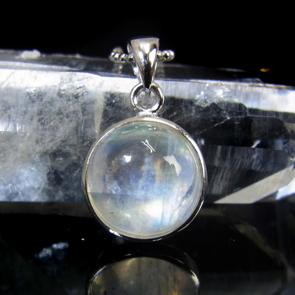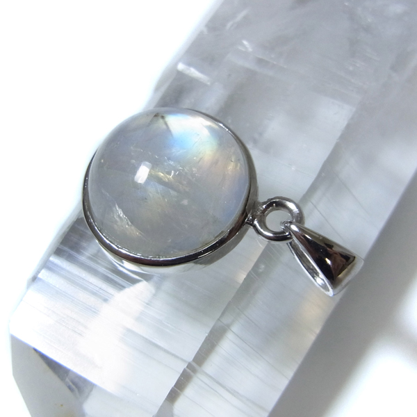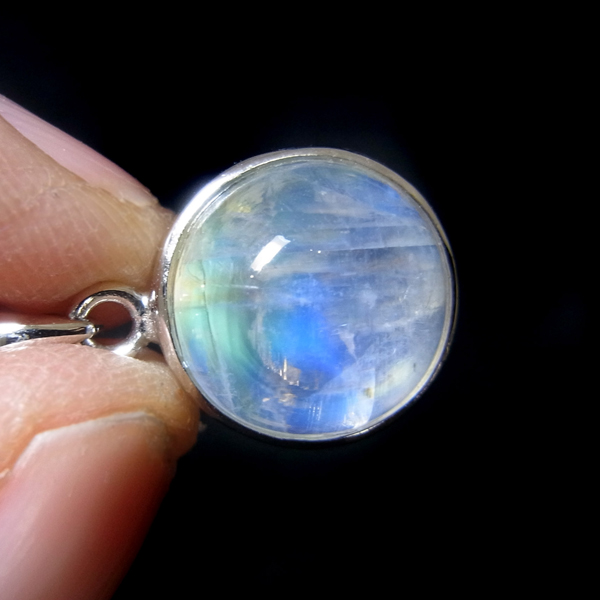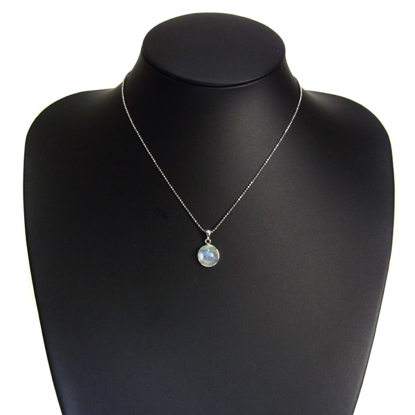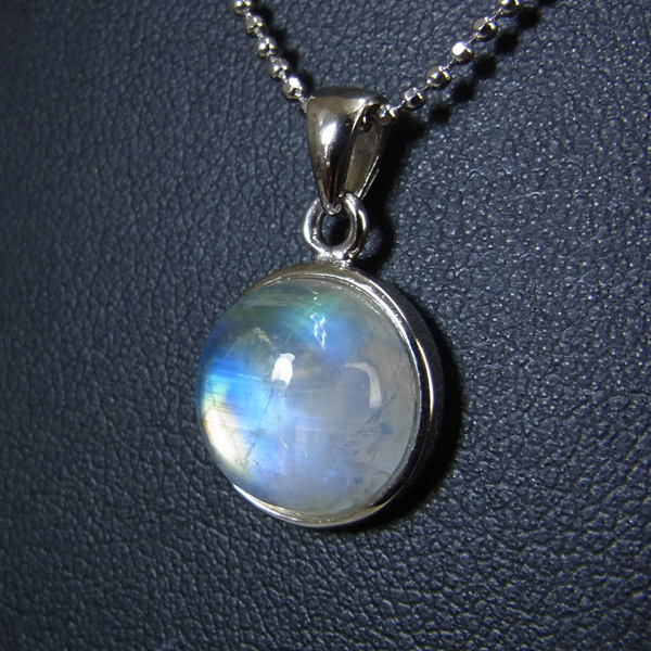 インド産ブルームーンストーンのペンダントトップです。このブルームーンストーンは、ネオンブルーの神秘的で素晴らしいシラーを楽しんでいただけます。また角度によってほんの僅かにオレンジ系のシラーが見られます。角度を変えたり、光源の方向によって、石の中でシラーが動き、様々な表情を見せてくれます。丸形でカボションにかわいく加工しています。小さめなペンダントトップをお探しの方におすすめです。