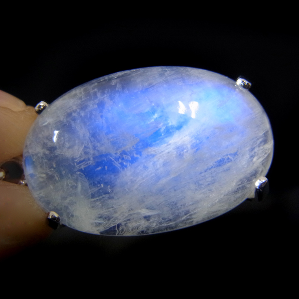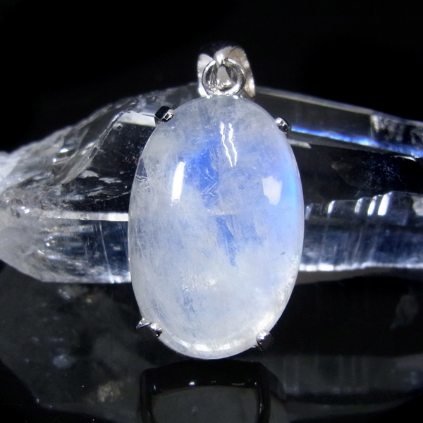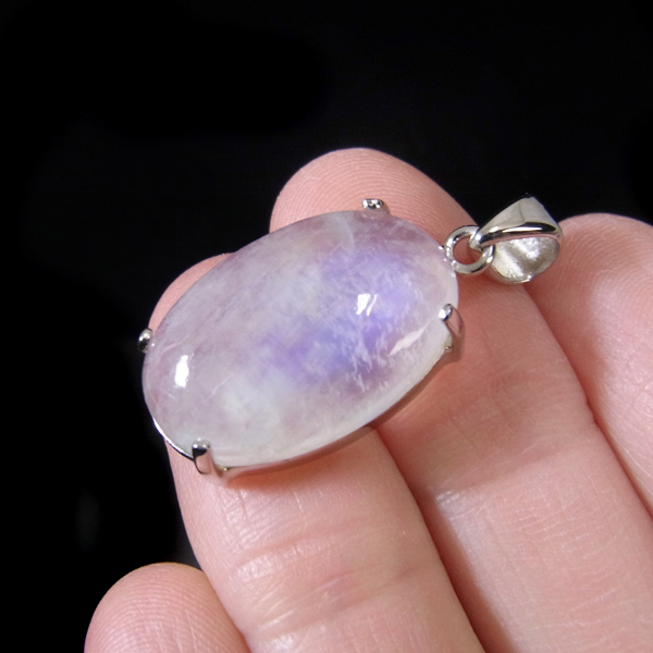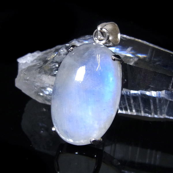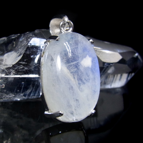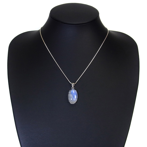 インド産ブルームーンストーンのペンダントトップです。このブルームーンストーンは、ネオンブルーの神秘的で素晴らしいシラーを楽しんでいただけます。また角度によってほんの僅かにオレンジ系のシラーが見られます。角度を変えたり、光源の方向によって、石の中でシラーが動き、様々な表情を見せてくれます。オーバル形で大き目に加工したため表面のシラーの表情がより楽しめると思います。