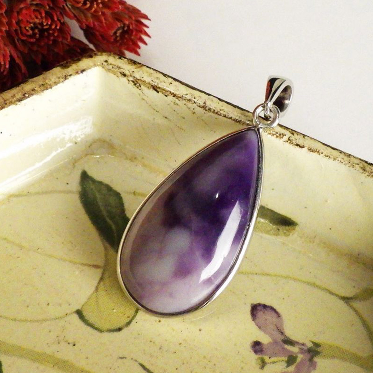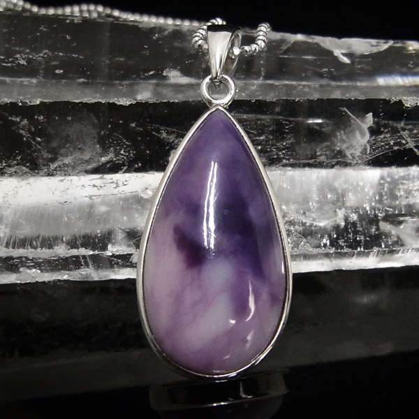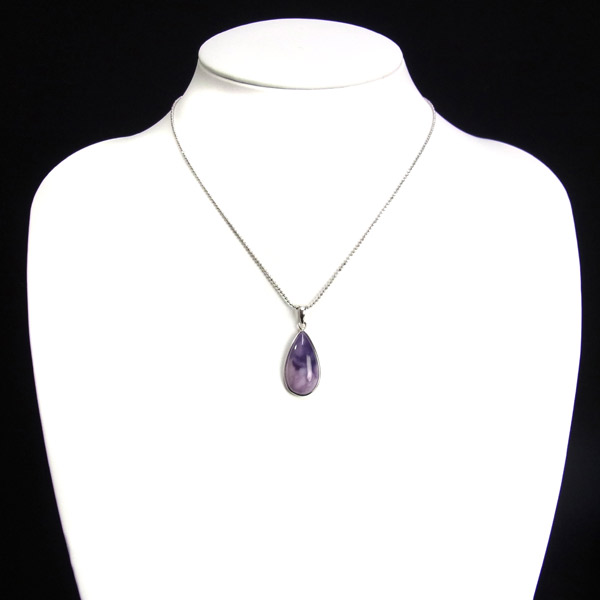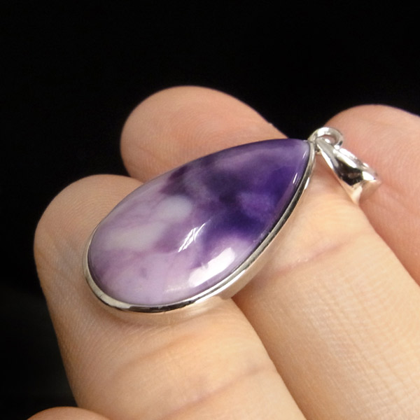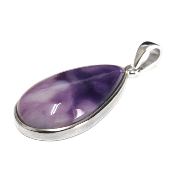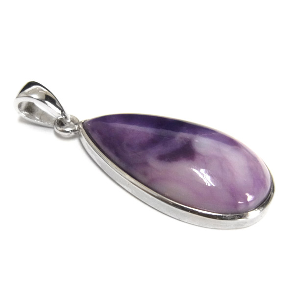 紫と白のマーブル模様が美しい、しずく型のティファニーストーンのペンダントトップです。ティファニーストーンはアメリカのユタ州にある山脈の周辺でしか産出されない希少な石で、オパール化したフローライトを主体にベリル、カルサイト、カルセドニーなどが混ざった混合石です。落ち着いた上品な色合いであたたかさを感じる質感です。アイスクリーム・オパライト、オパライズド・フローライト、バートランタイトなどの別名があります。
