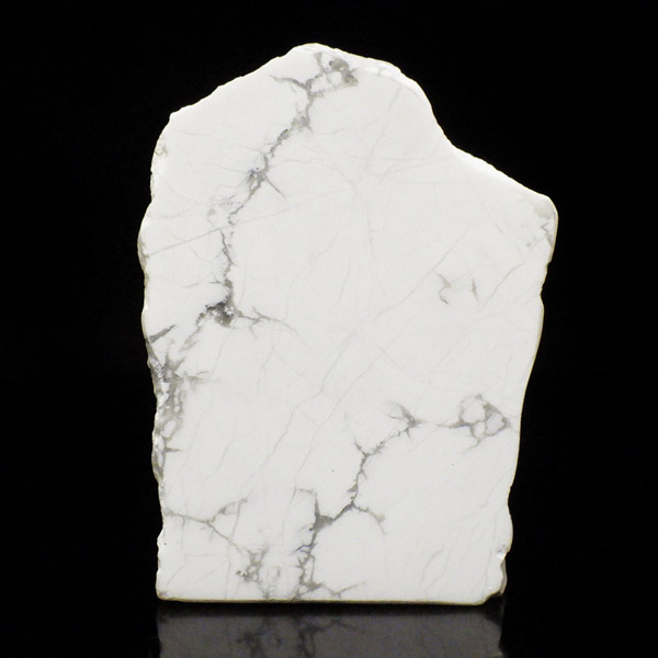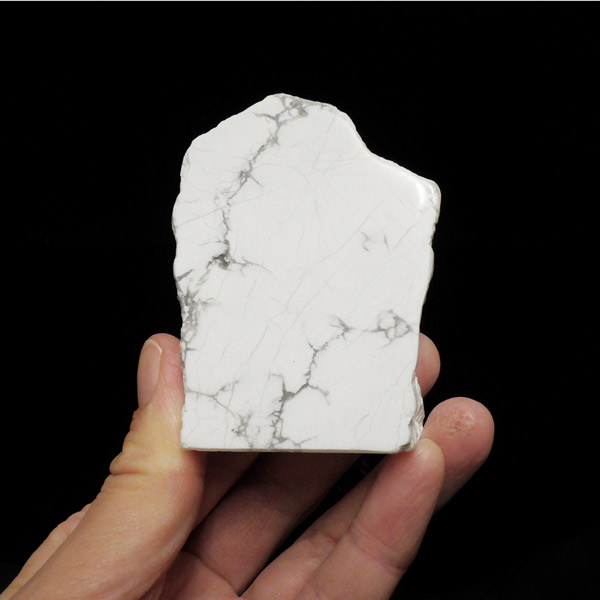 ホワイトハウライト(マグネサイト)の一面磨き原石です。研磨されて美しい前面部分と磨けば光る原石部分、両方が楽しめます。底面は平たくカットされ安定しており、大きさも置きやすいサイズ。インテリアとしてもとてもかわいい原石です。