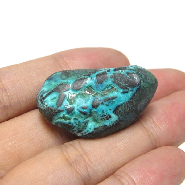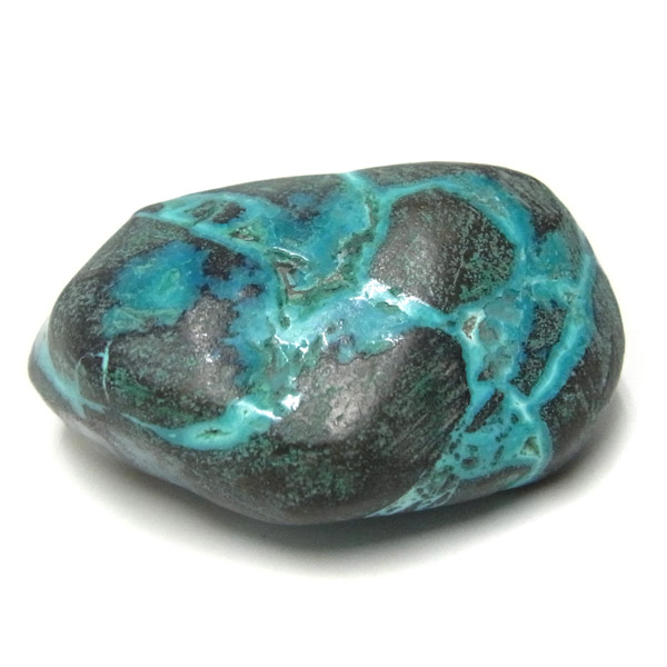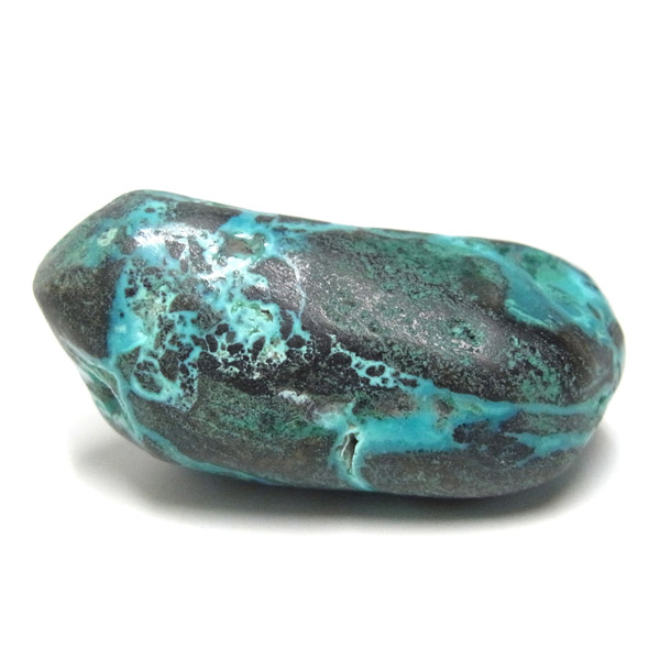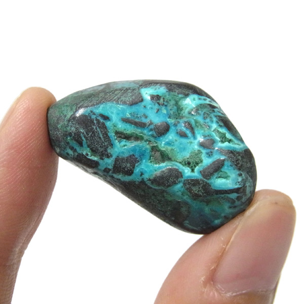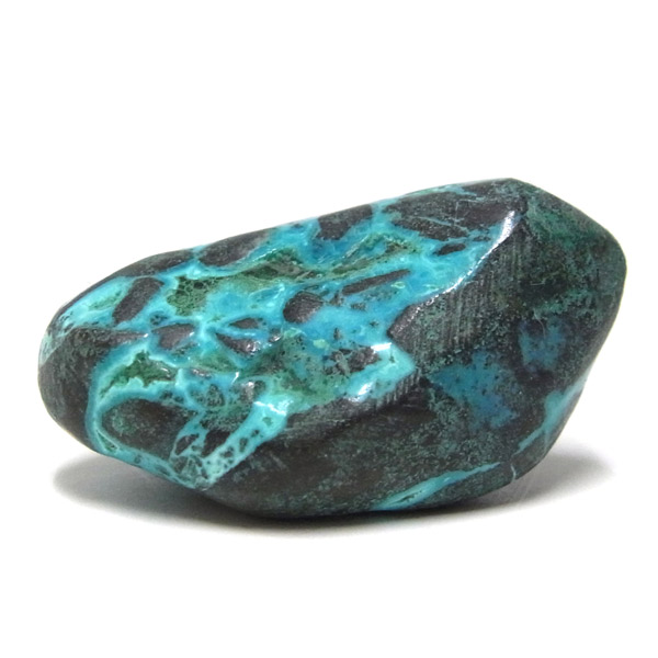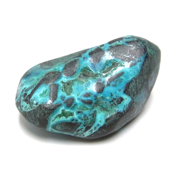 コンゴ産のシャッタカイトのタンブルです。 コンゴ産のシャッタカイトは、まだまだ新しい これから注目される鉱物です。シャッタカイトは銅のケイ酸塩の水酸化物の鉱物で、1915年に最初に発見されたアメリカのアリゾナ州のシャッタク鉱山が名前の由来です。 そこではマラカイトも産出されましたが、マラカイトの結晶を保ったまま成分が入れ替わる、仮晶という現象が起き、それがシャッタカイトとして発見されました。シャッタカイトは鮮やかなブルーグリーンが特徴の鉱物です。